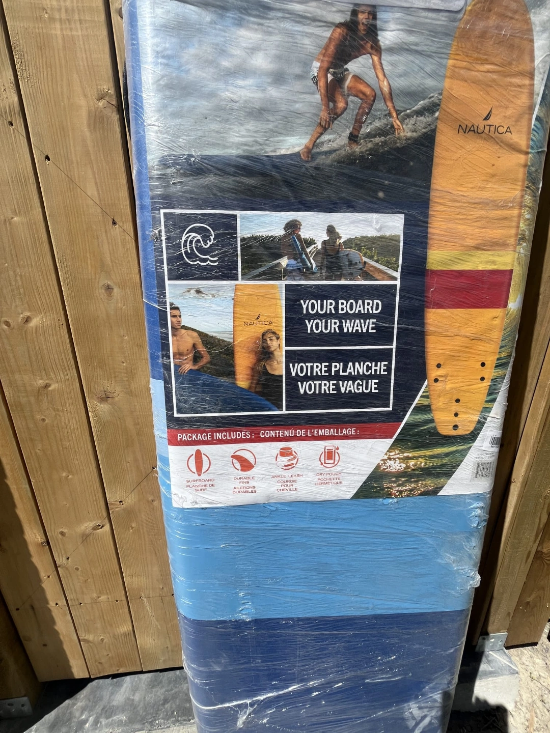 54Brand new Nautica foam surfboard. 7'6" long. Still in original packaging. Great for beginners. Includes leash, fins and board bag.