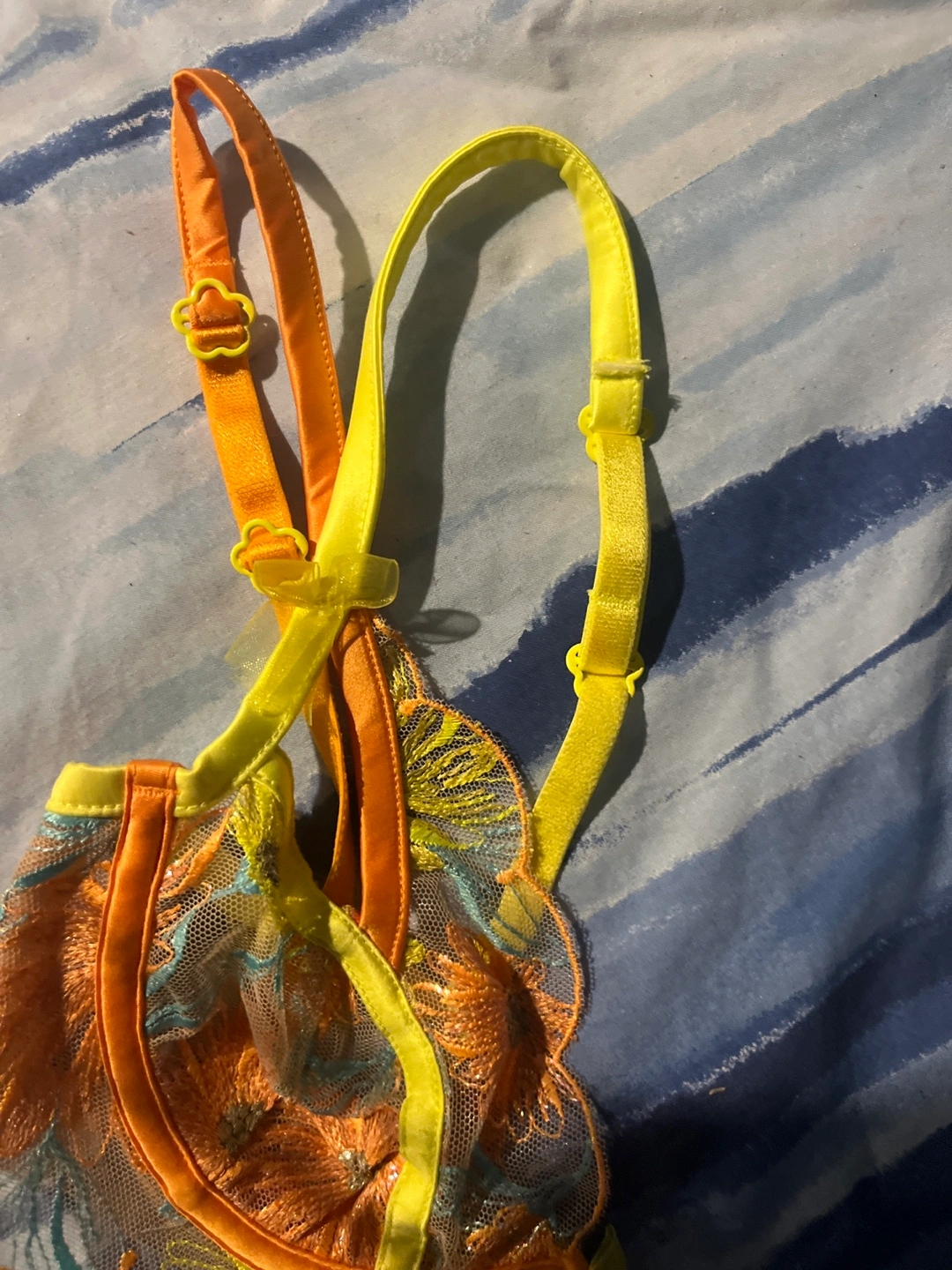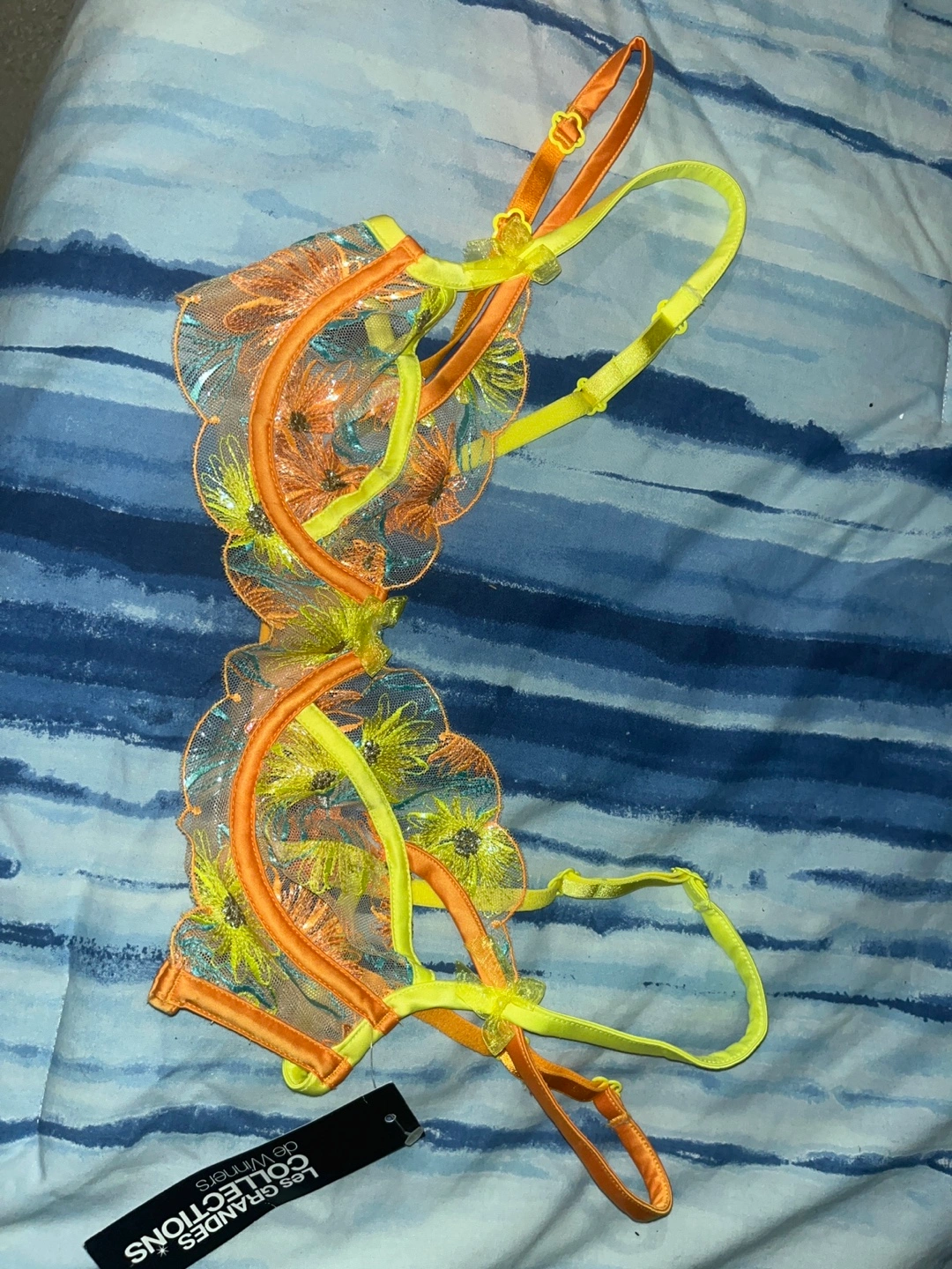 Bright orange and neon yellow floral embroidered bra. Delicate lace detailing. Adjustable straps. New with tags.