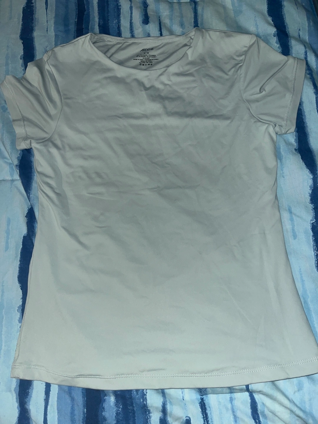 Light off white , short-sleeved, fitted t-shirt. Made of a soft, stretchy material. Great for layering or wearing on its own. Like tna worn 1 time and to small