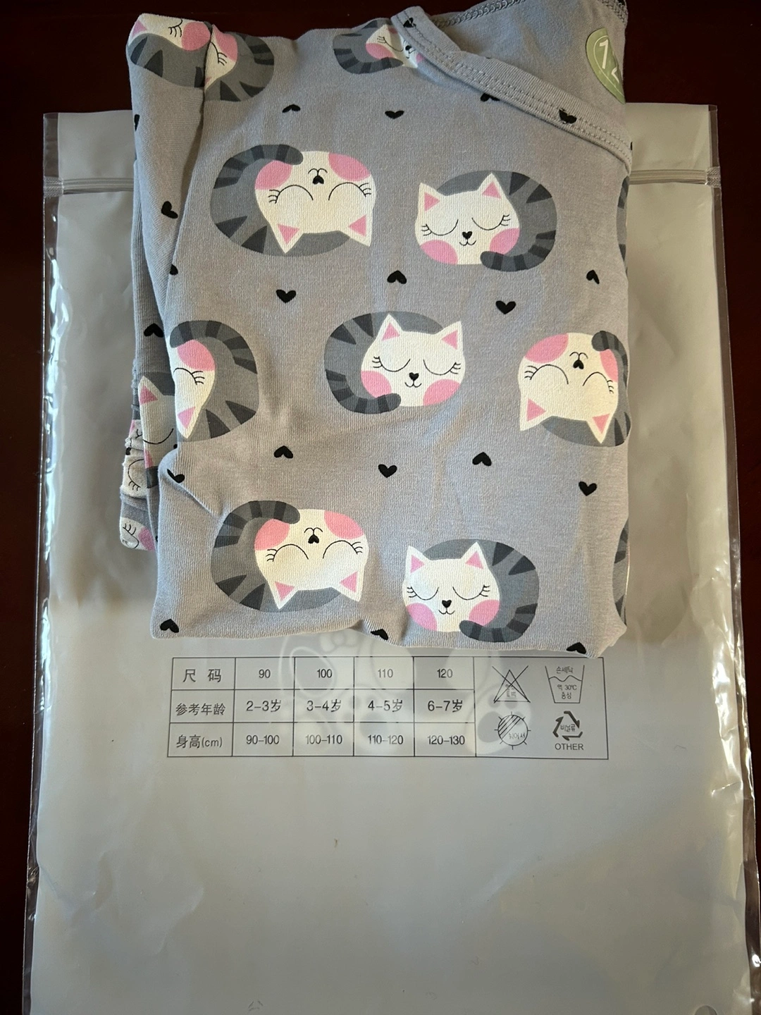 1000+Grey long-sleeve pyjamas. Long pants. Features adorable cat print. Size 120, fits approximately 6-7 year olds. Brand new in package with tags on