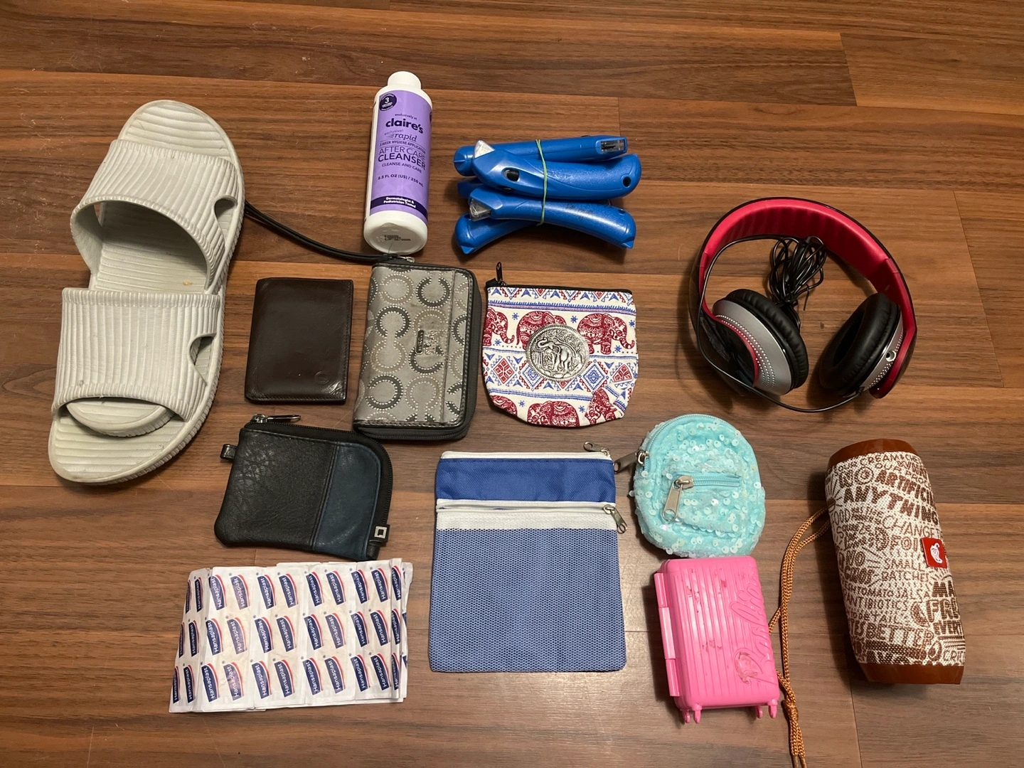 Unused headset, Bluetooth speaker, wallets for male and female, pouches, cutters, unisex slippers, band-aids, after care cleanser (exp: June 2025)