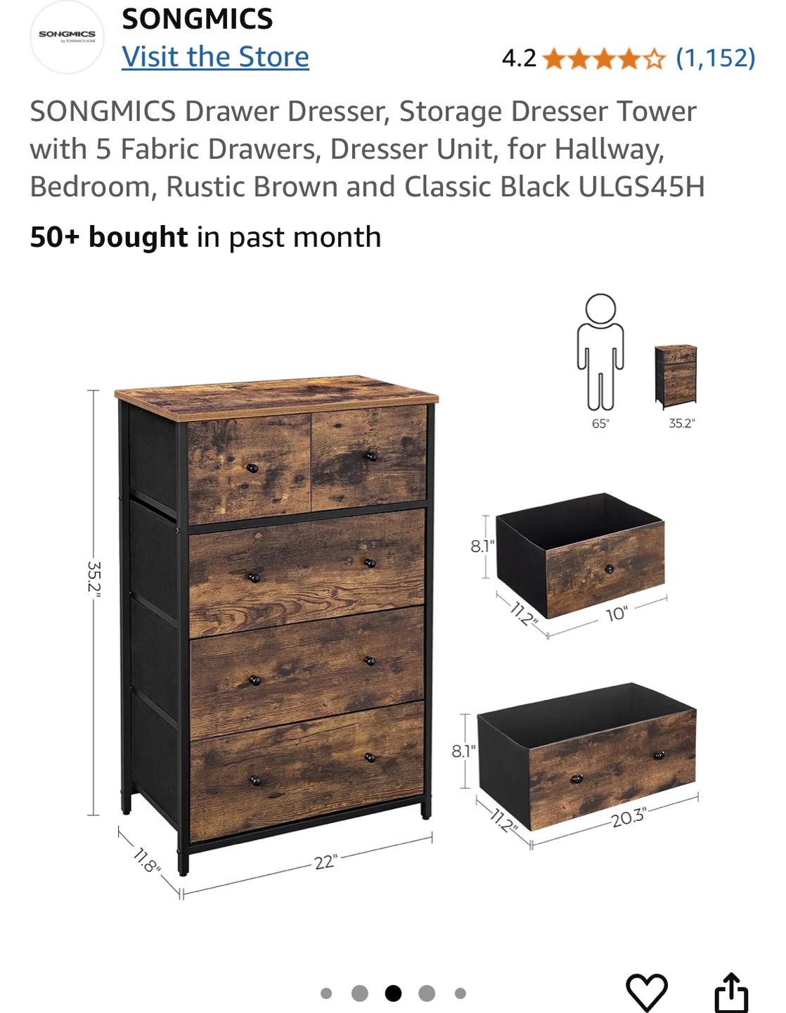 Buy & SellSONGMICS 5-Drawer Storage Dresser (just 1 available)SONGMICS 5-Drawer Storage Dresser (just 1 available)$50Rustic brown and classic black finish. Five fabric drawers. Metal frame. Great for bedroom or hallway. Excellent condition. One is available.ConditionGoodWHERE TO MEETCheck LocationView MapSELLERverifiedElviraYonge Eglinton1175 reviews7 chats·6 favorites·166 viewsSEND CHAT TO SELLERHi Elvira! I’m interested in your listing.Hi Elvira! I’m interested in your listing.Get the Karrot app to chatSign In to chat
