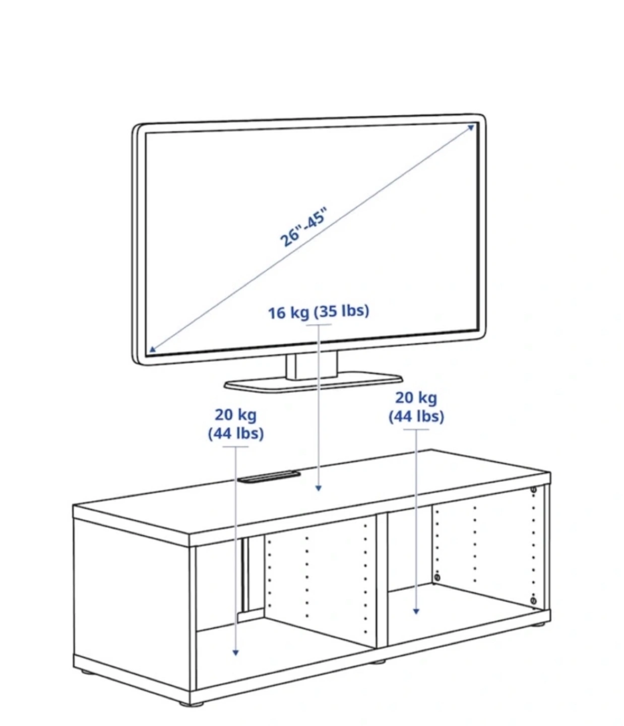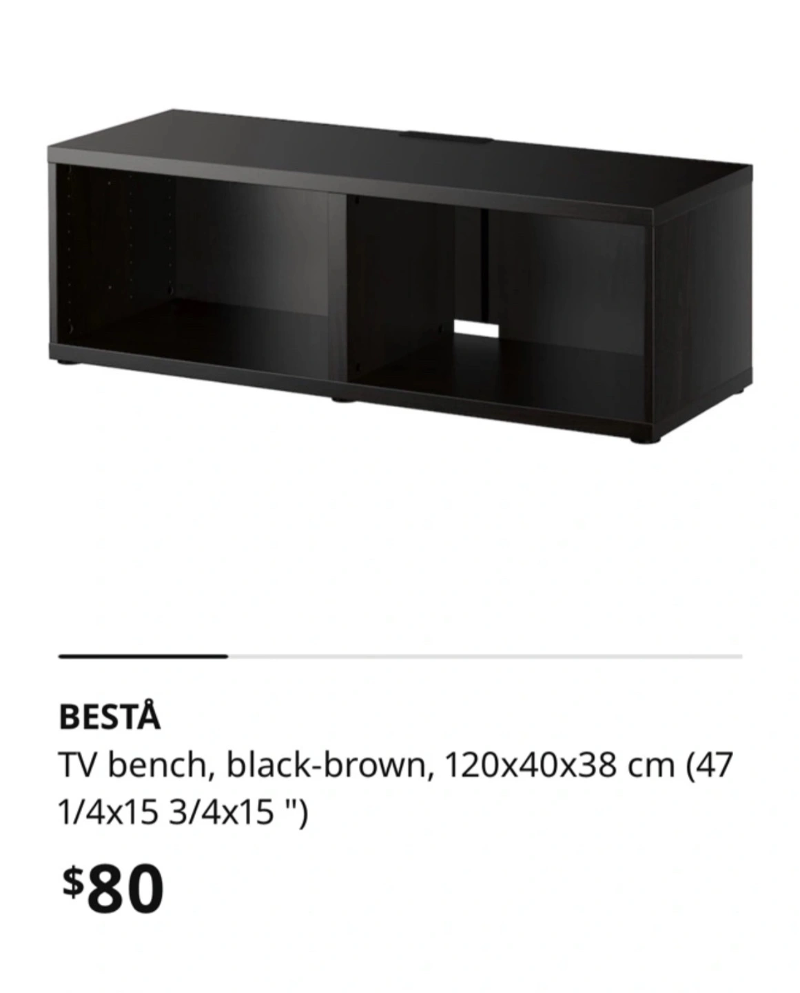 IKEA BESTÅ TV bench. Black-brown colour. 120x40x38 cm. Great for storing media components. Open shelving design.