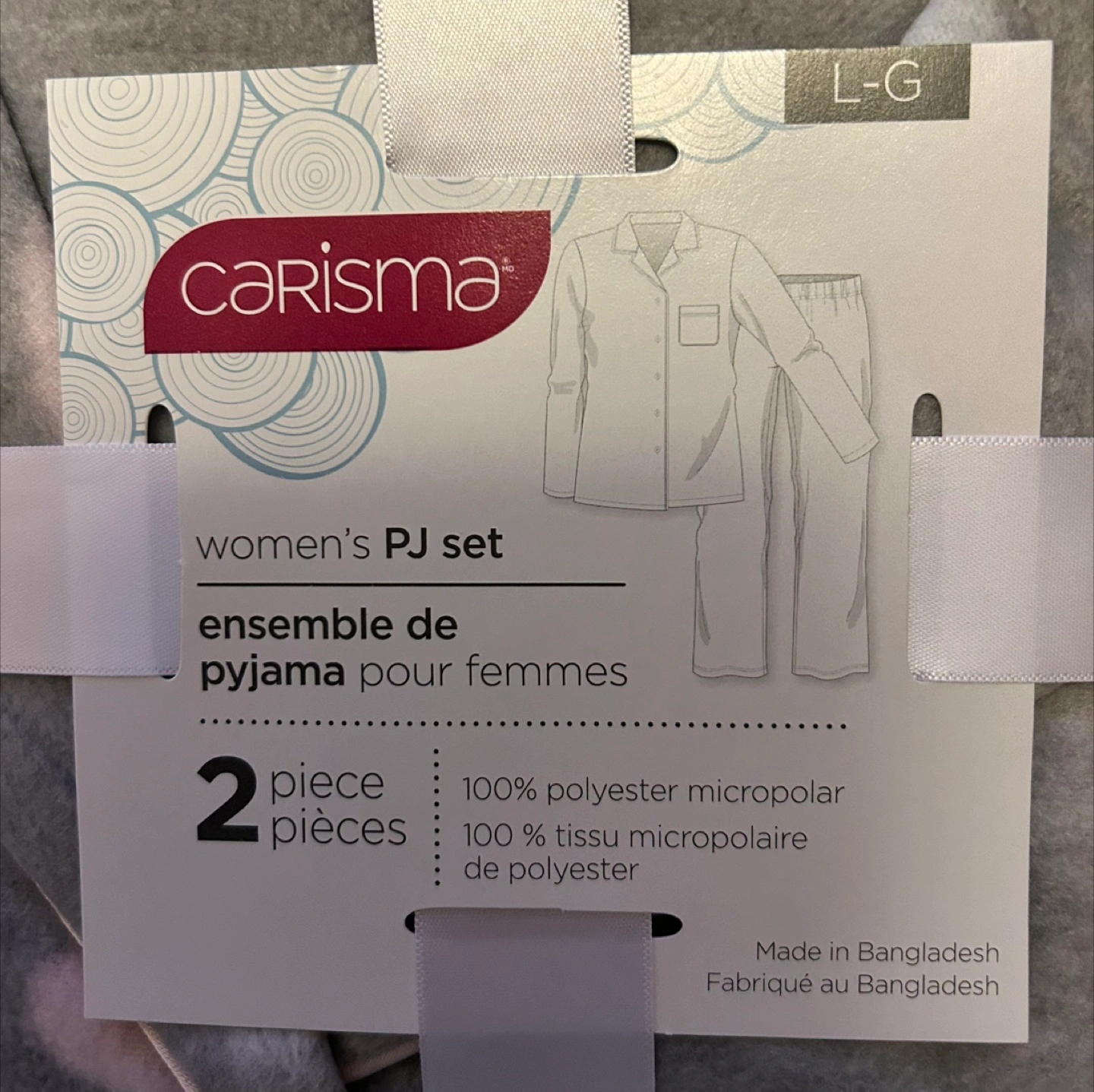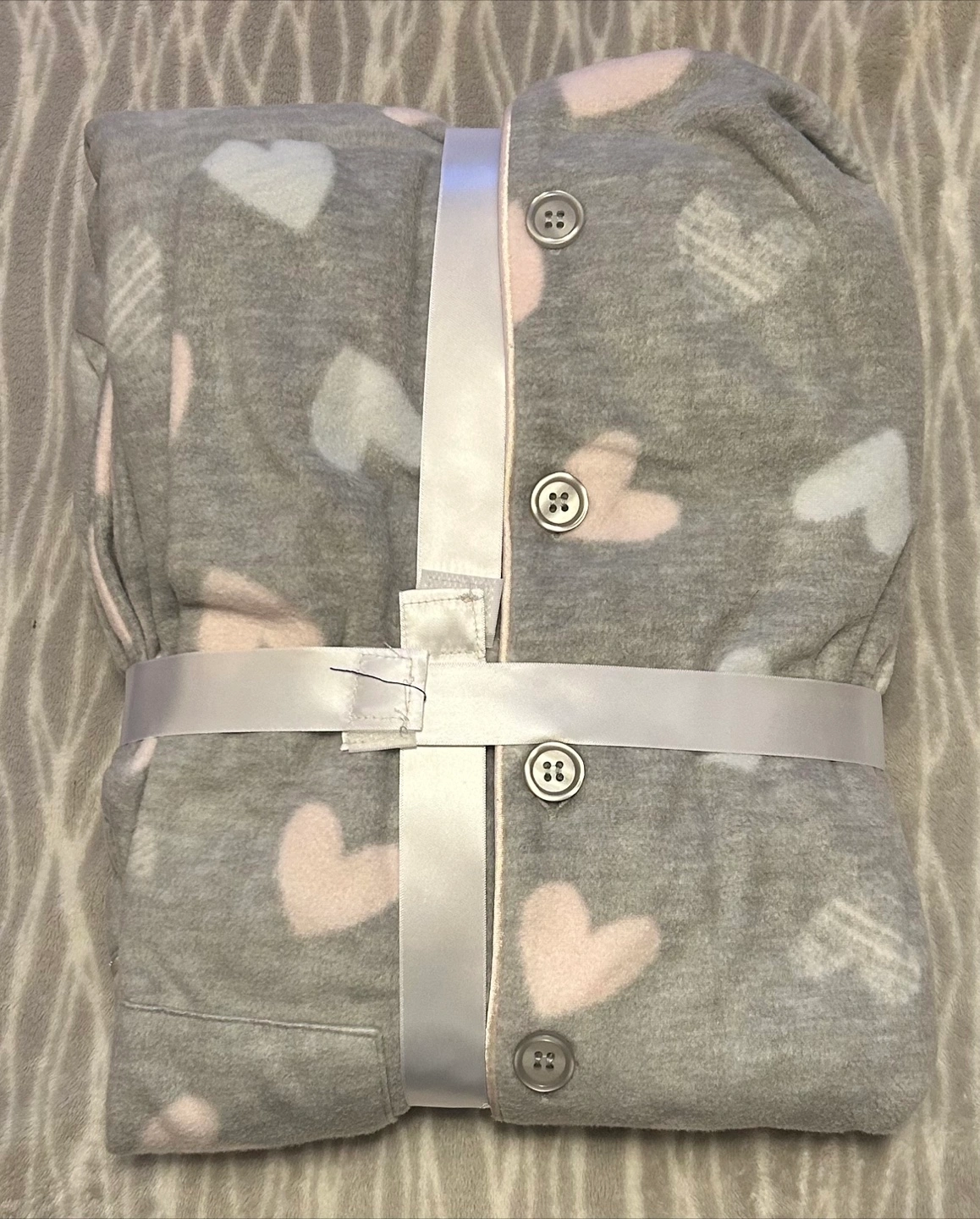 310Cozy women's pajama set. Grey microfleece with pink and white hearts. Button-up top and matching pants. Size large/grande. New with tags. 100% polyester. 😊
