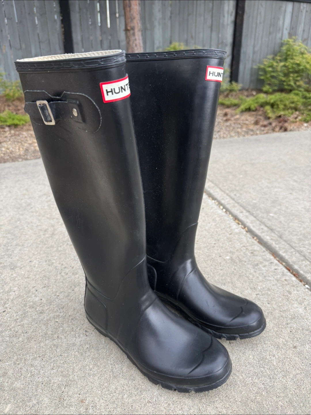Women's black rain boots. Gloss finish. Tall shaft. Good for rainy weather. Original Hunter tall style. European 39