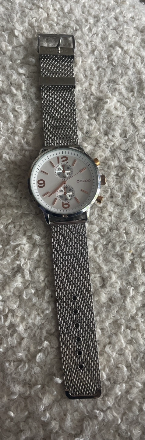 Stylish silver watch. Features a white face(2 inches wide), rose gold accents, and a metal mesh band.