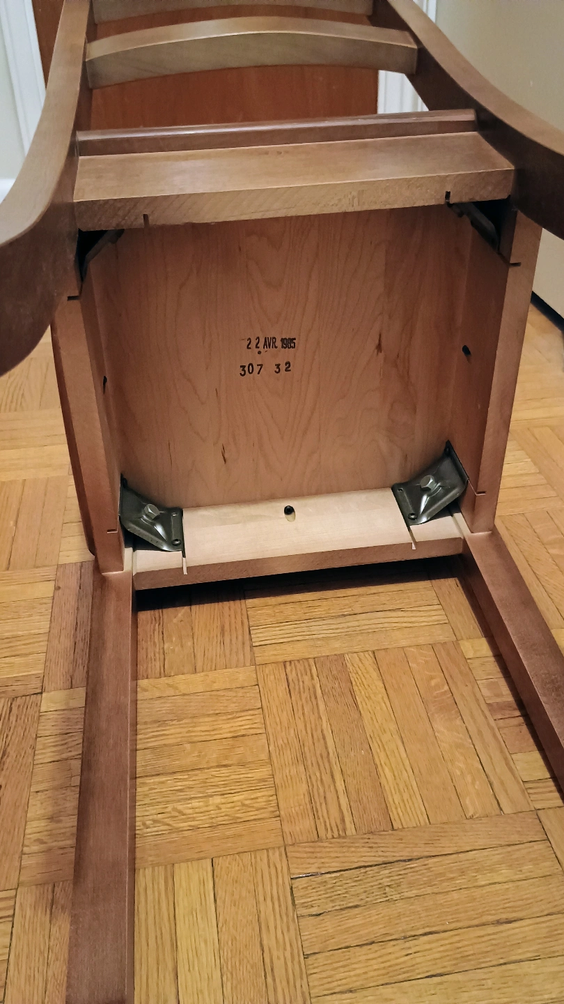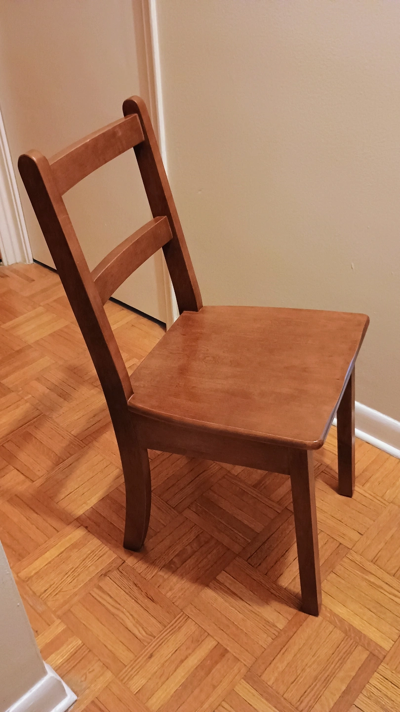 Simple, sturdy, wooden chair. Brown finish. Suitable for desk or kitchen. Minimalist design. Features a ladder-back design. Very sturdy solid wood. Very good condition from non-smoking home.