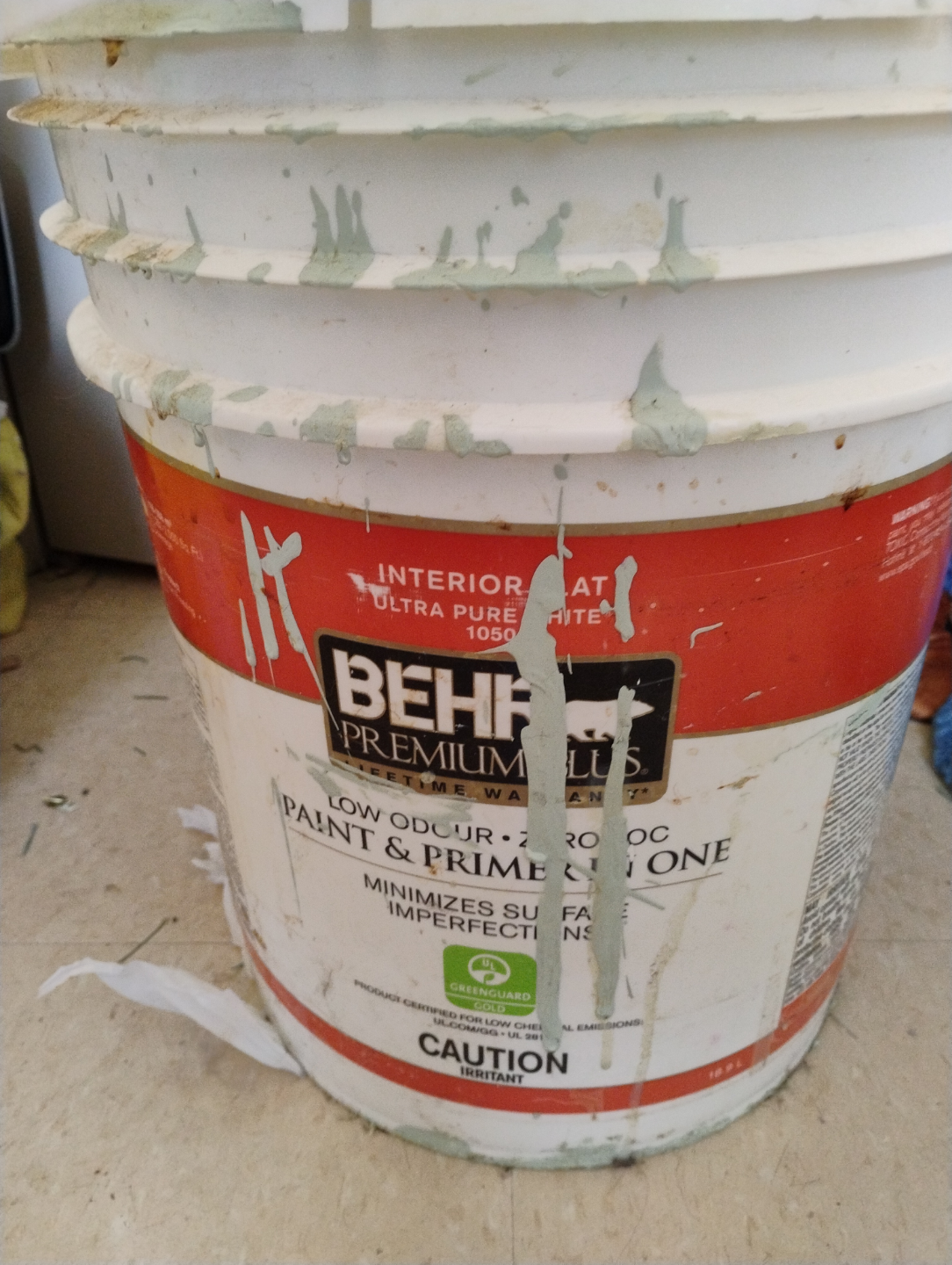 5 gallon of Behr Premium Plus Ultra Pure green interior paint and primer. Low odour, zero VOC. Minimizes surface imperfections. Some paint residue on the outside of the pail. Used hardly any pretty much full. $218.00 plus tax cost me . Reason for selling as I'm moving and place is already painted. $100. Will throw in Glidden ultra which is grey about 1/2 full or less and Glidden Pro flat for walls and ceilings which is between 1/4 to half full. Moving out sale . was going to paint my whole place but decided to move .