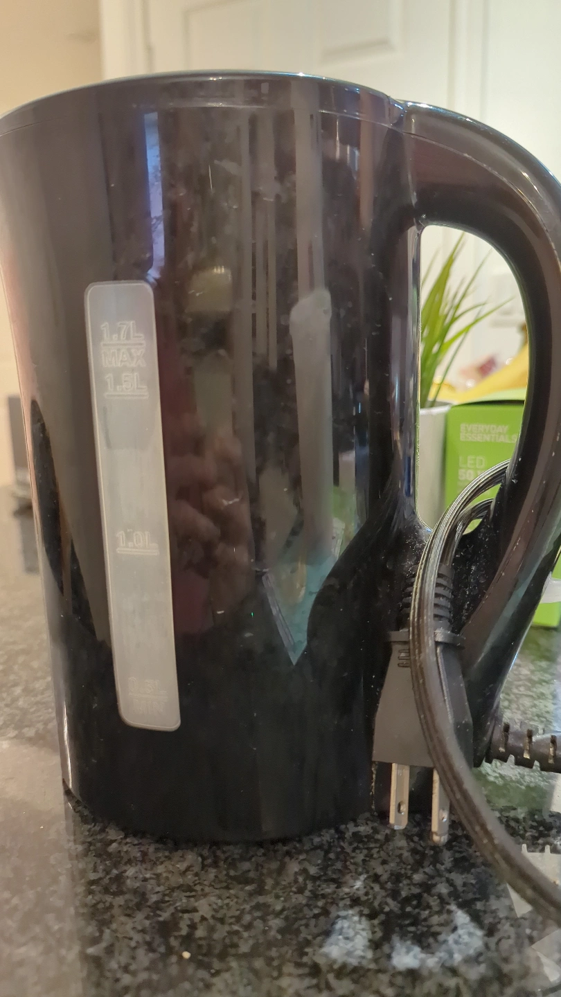Used black electric kettle. 1.7L maximum capacity. Includes power cord. Shows some minor wear.