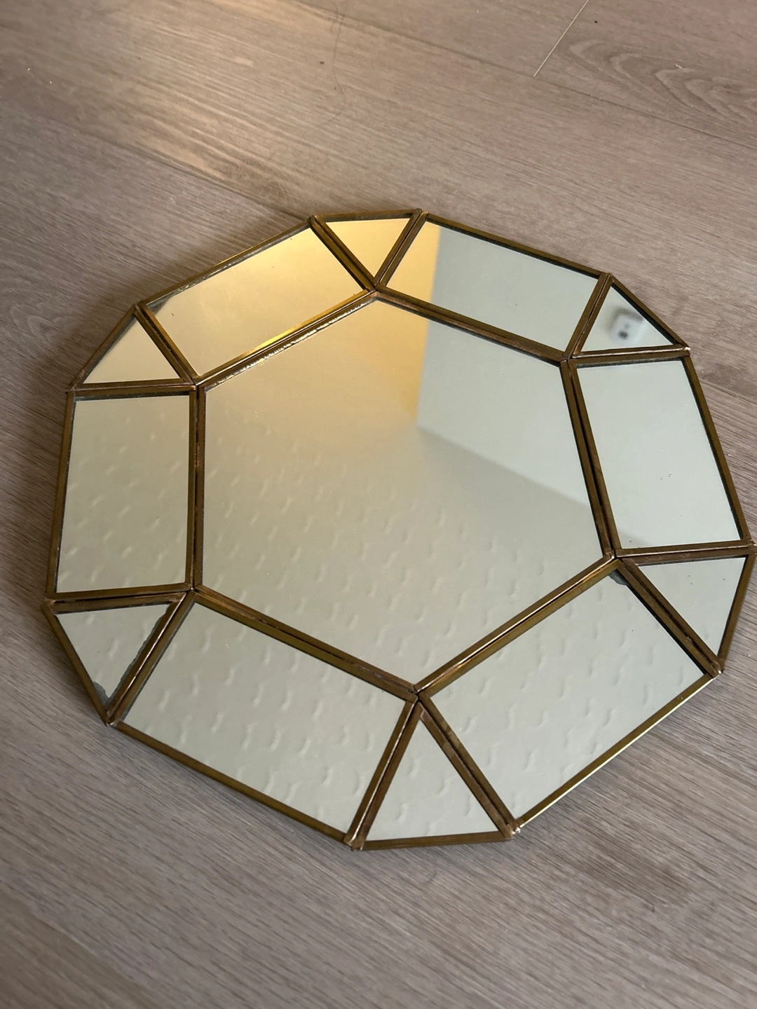Octagonal mirror. Brass frame. Minor damage to one corner that affects the price. Beautiful Unique design. Adds character to any room.