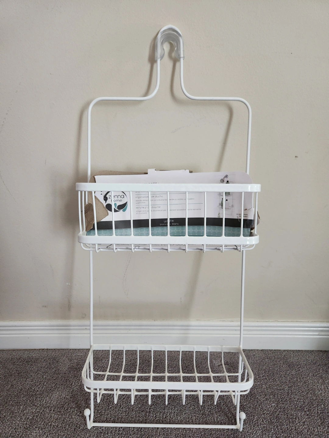 White metal shower caddy. Two shelves and a towel bar. Easily accessible shower storage. New in box.