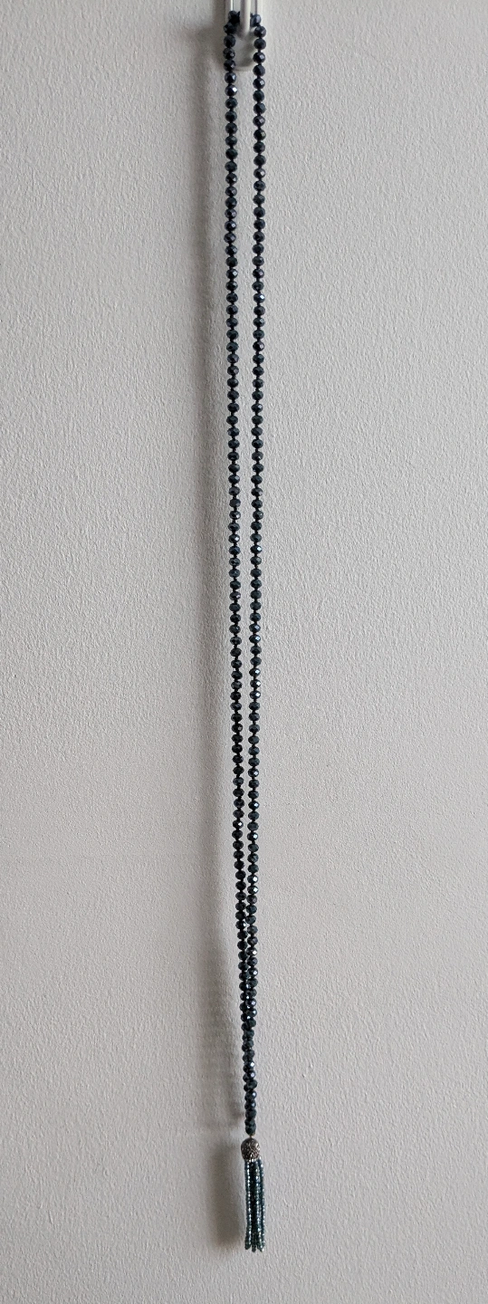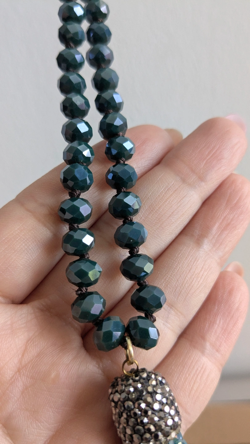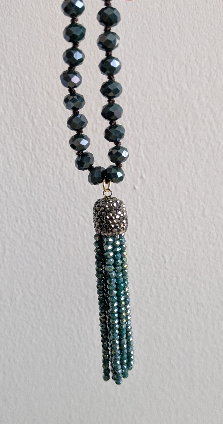 Brand New! Gorgeous dark teal crystal beaded necklace. Hand knotted. Features a sparkly crystal tassel. Approximately 145cm length, perfect for doubling up!