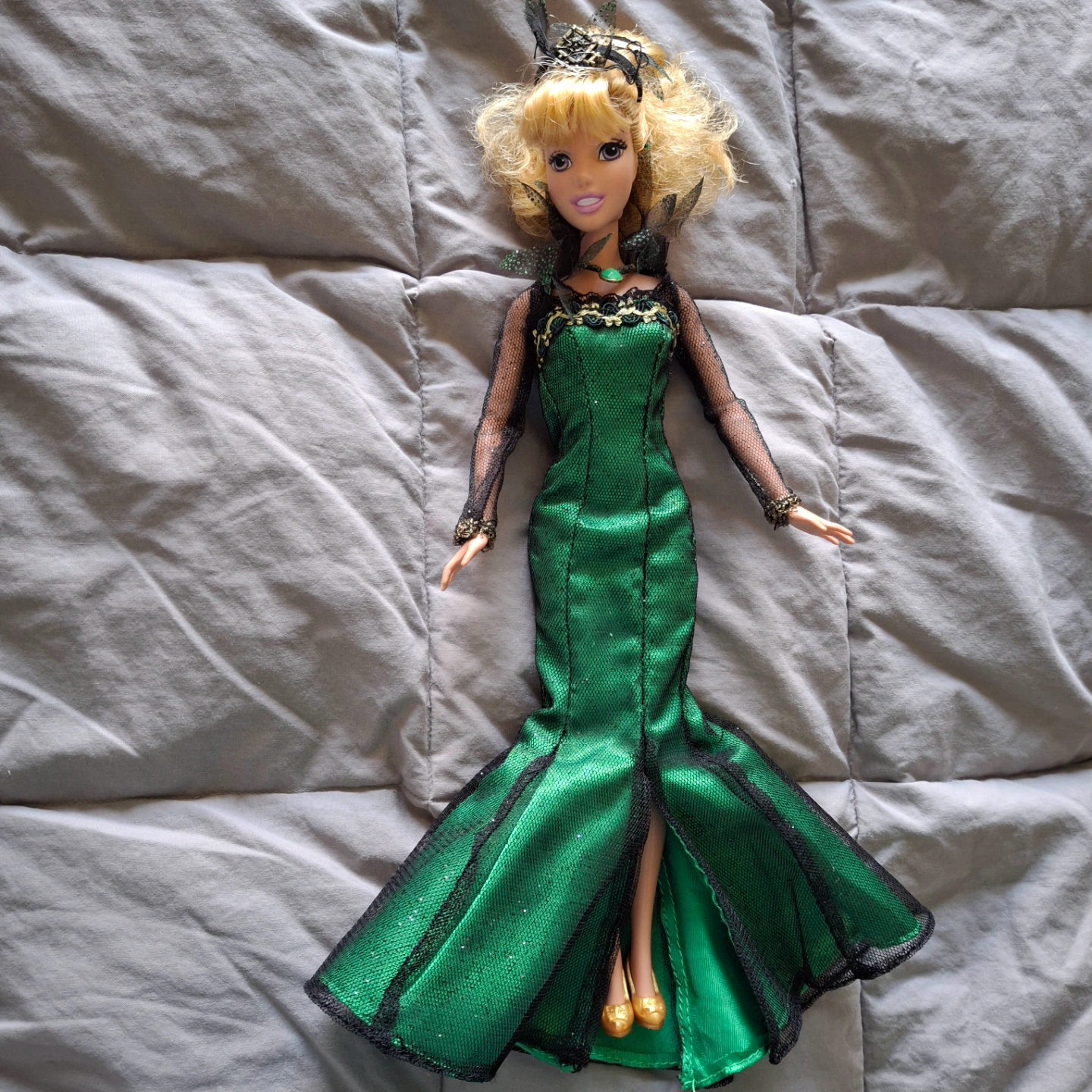 Collectible fashion doll. Features long blonde hair, green sparkly gown, and black mesh overlay. Gold shoes and jewelry included. Great for collectors or children.