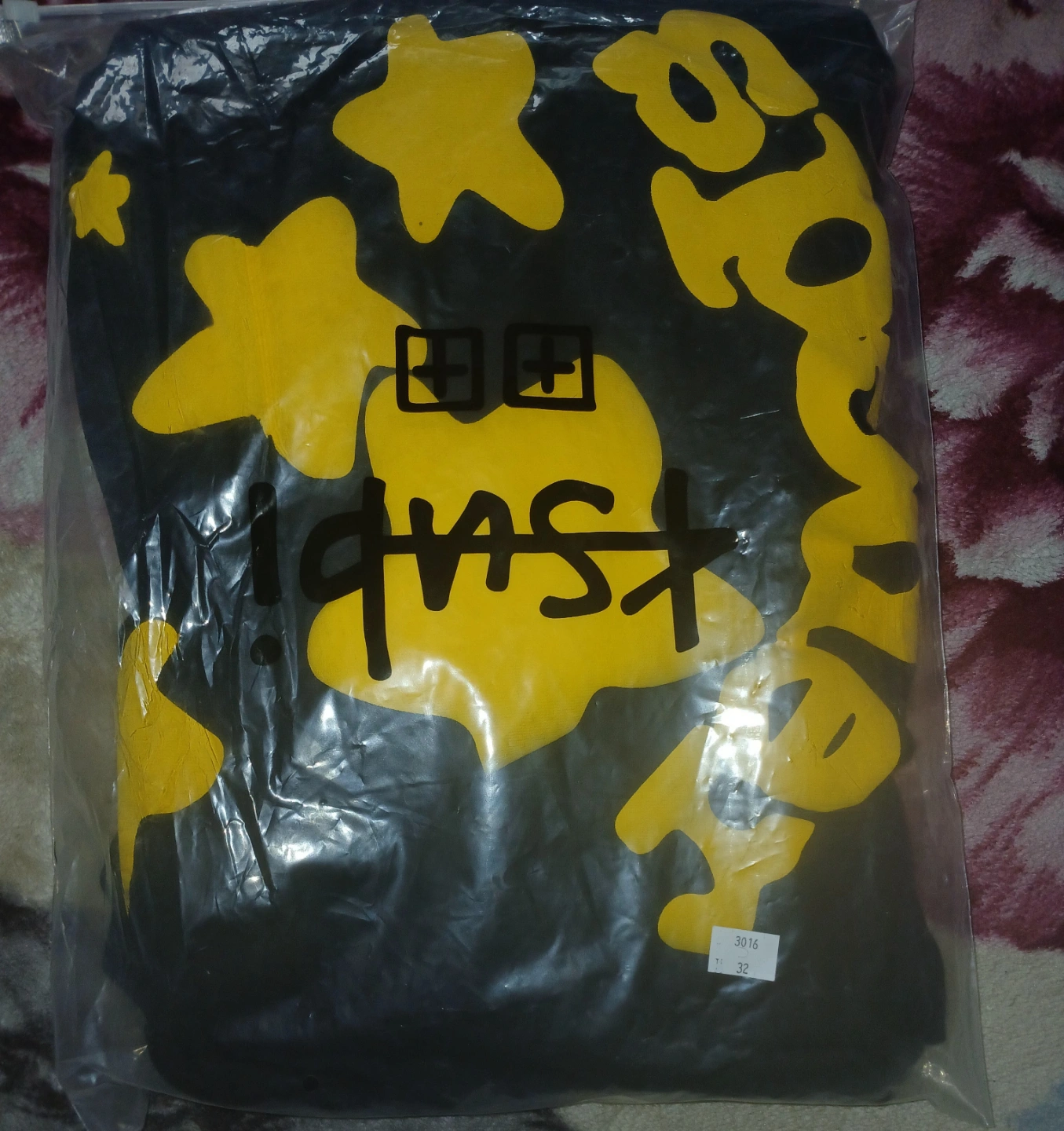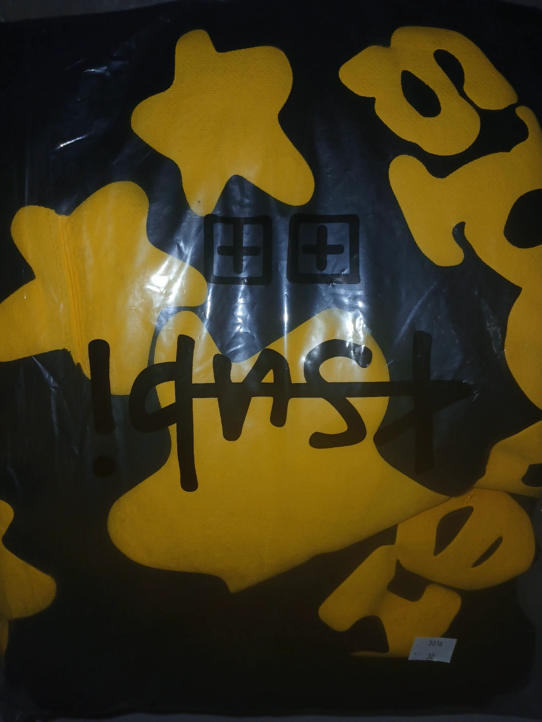 Black hoodie. Yellow graphic print. Size large. New with tags. Unique design. Comfortable material.