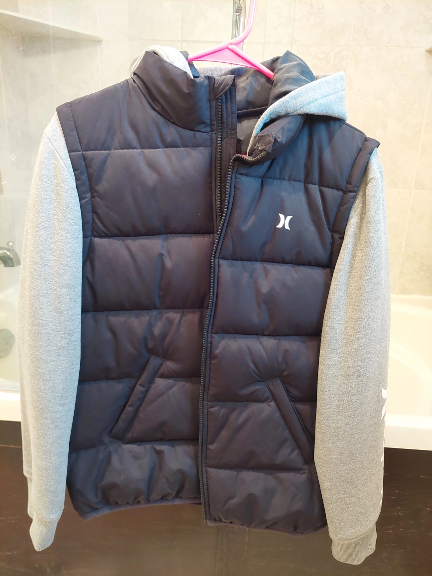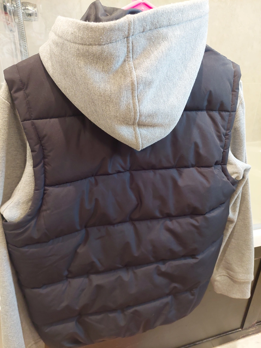 Black puffer vest with grey hoodie combination. Kids size XL but will fit a shorter, slimmer adult. Zipper closure. Warm and comfortable.