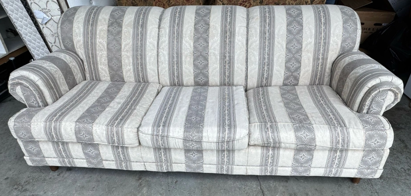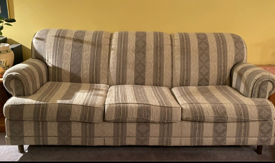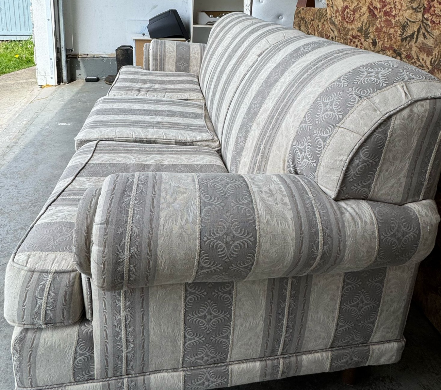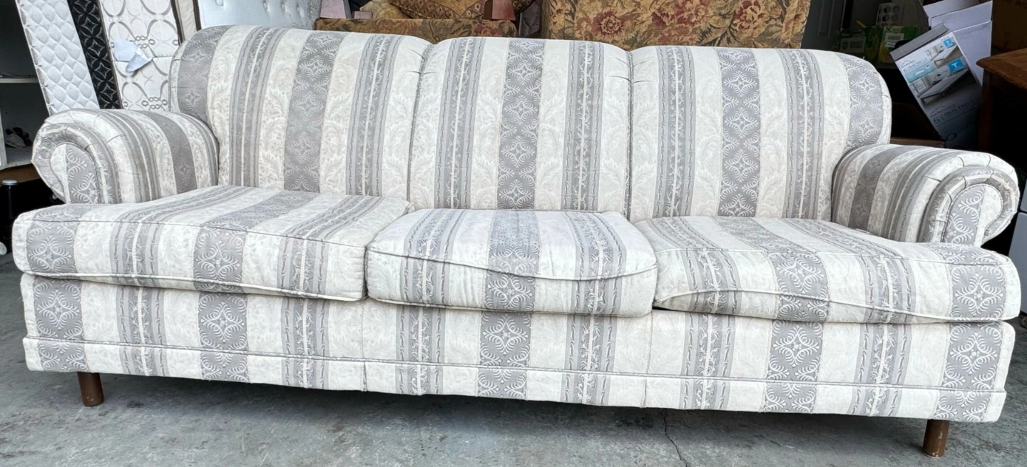 Three-seater sofa. Rolled arms. Beige and grey striped upholstery. Wooden legs.
