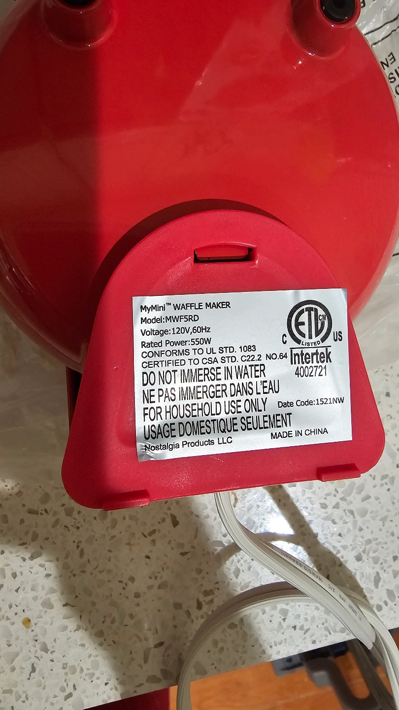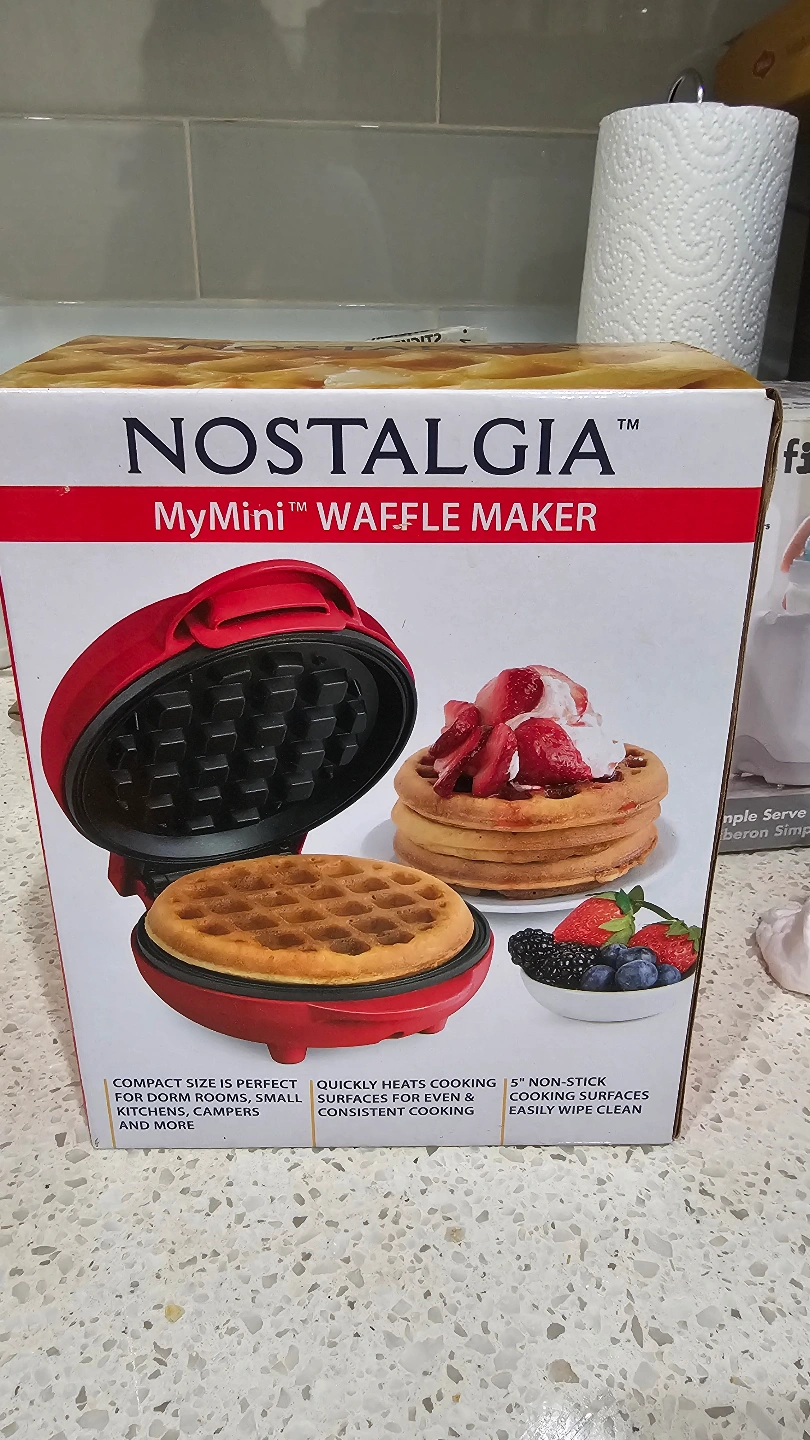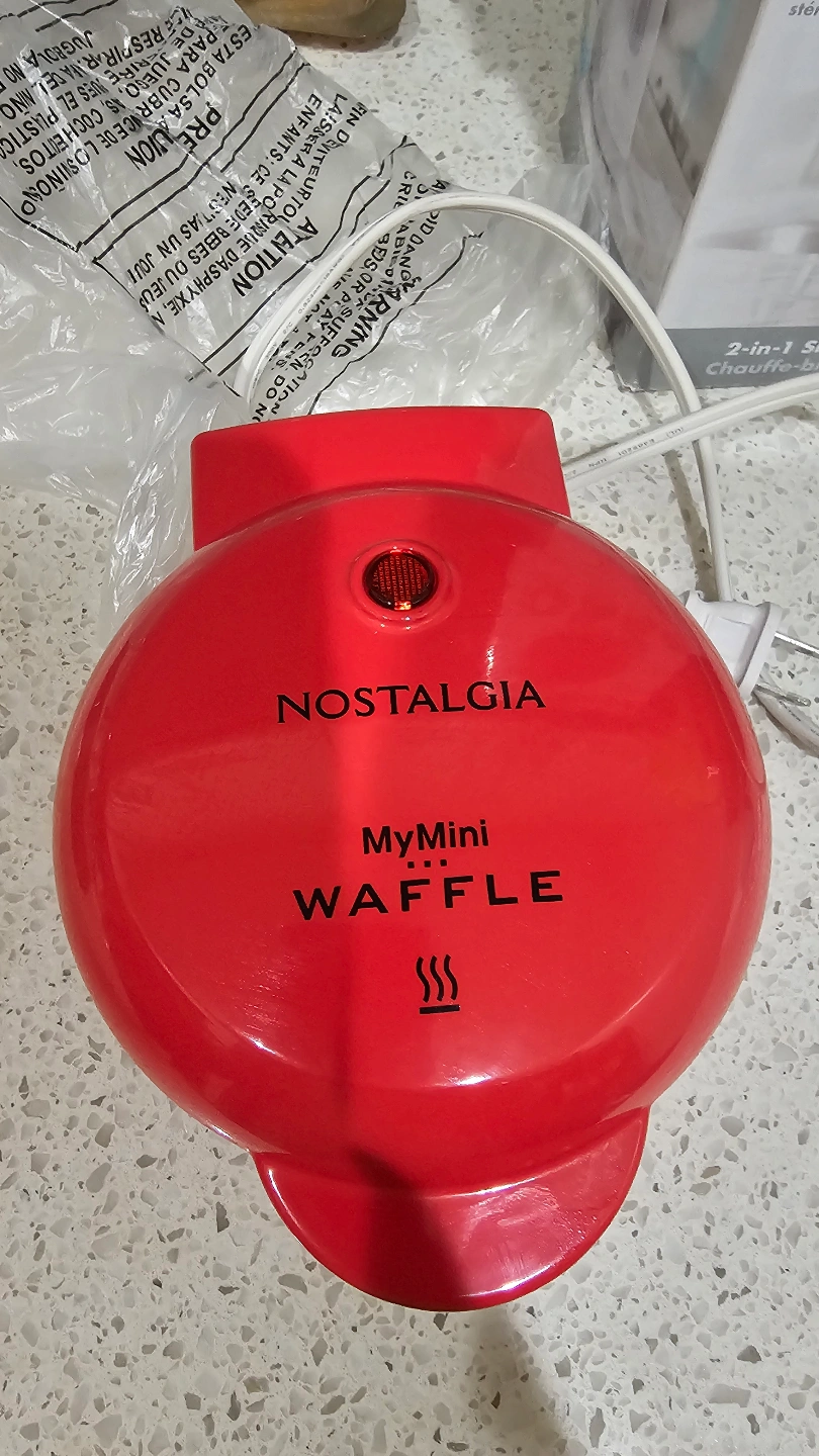 Compact waffle maker. Makes mini waffles. Easy to clean. Perfect for dorms, small spaces, campers, and more. Includes instruction manual. Red color. it was gift never used.