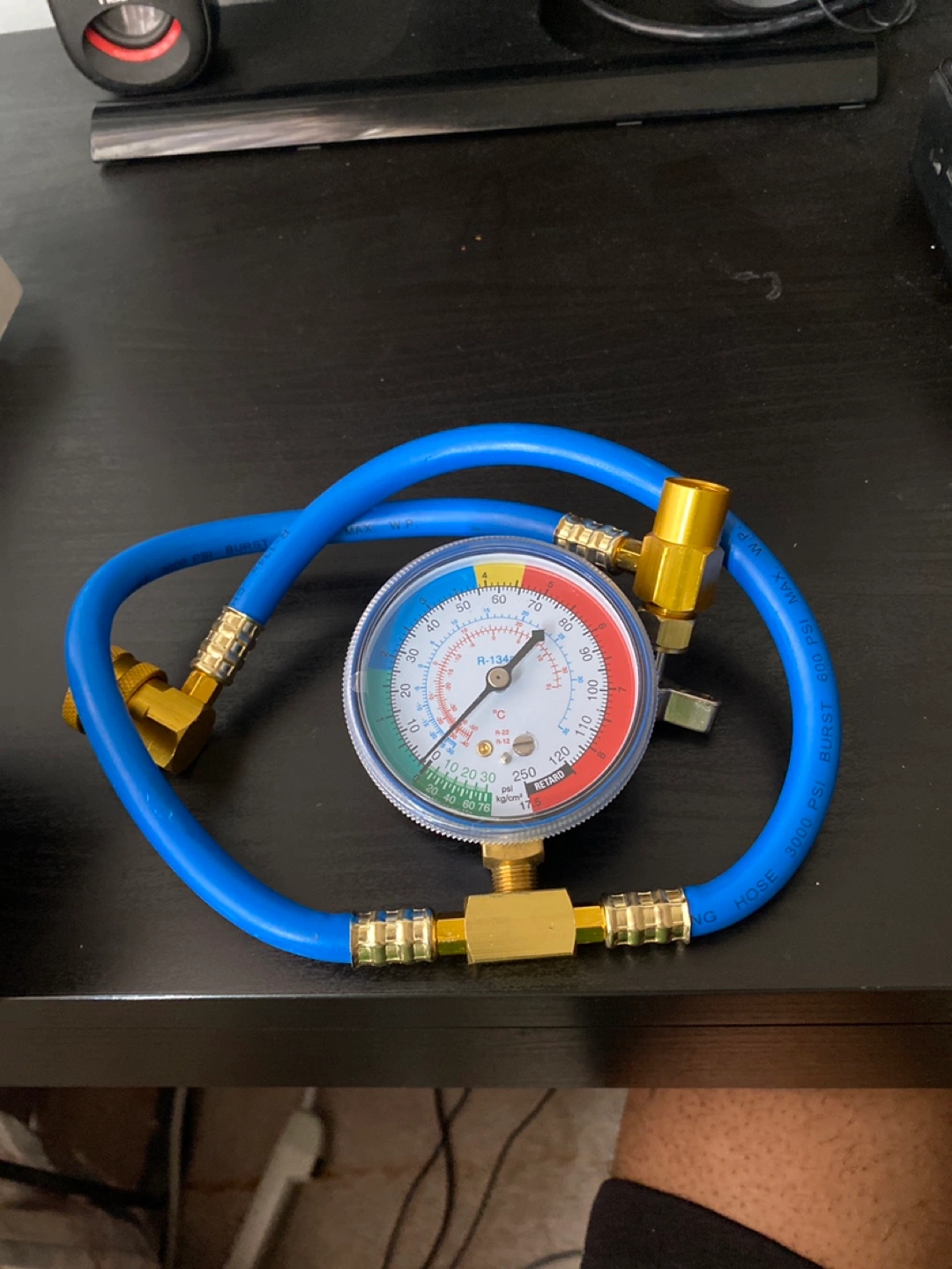 Used refrigerant gauge set. Features blue hoses and brass fittings. Measures pressure in PSI and kg/cm². Includes R-134a markings.