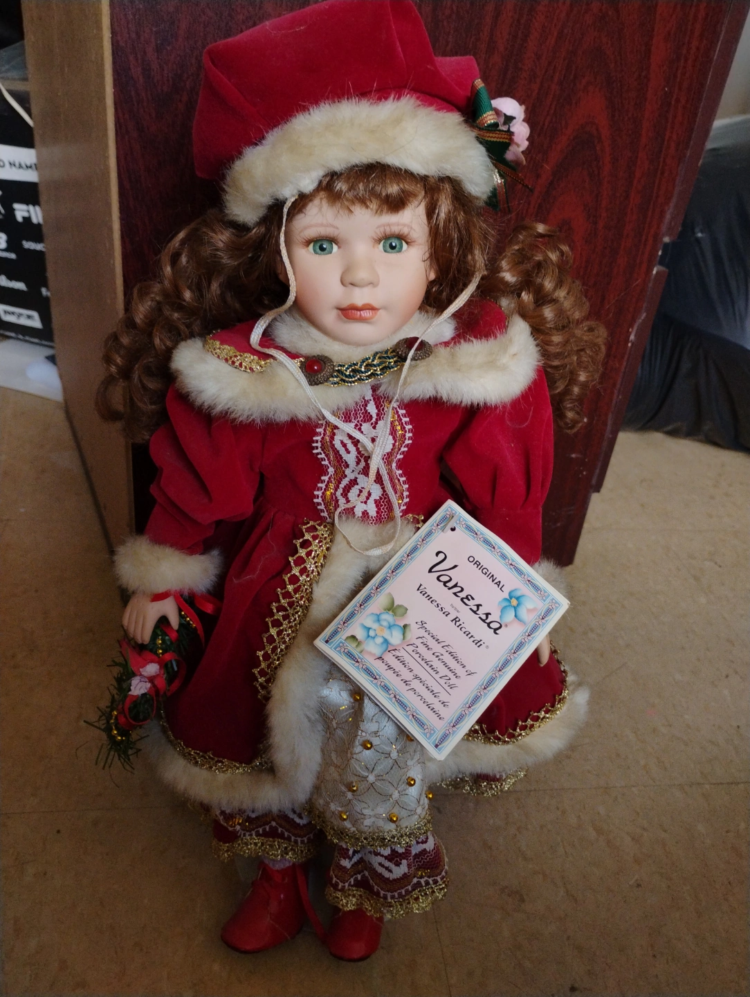 Collectible porcelain doll. Red velvet dress, white fur trim. Curly brown hair. Red boots. Comes with original tag. hat needs a new ribbon around neck . Dress needs a clean down .Doll is holding wreath. Christmas collectuon.