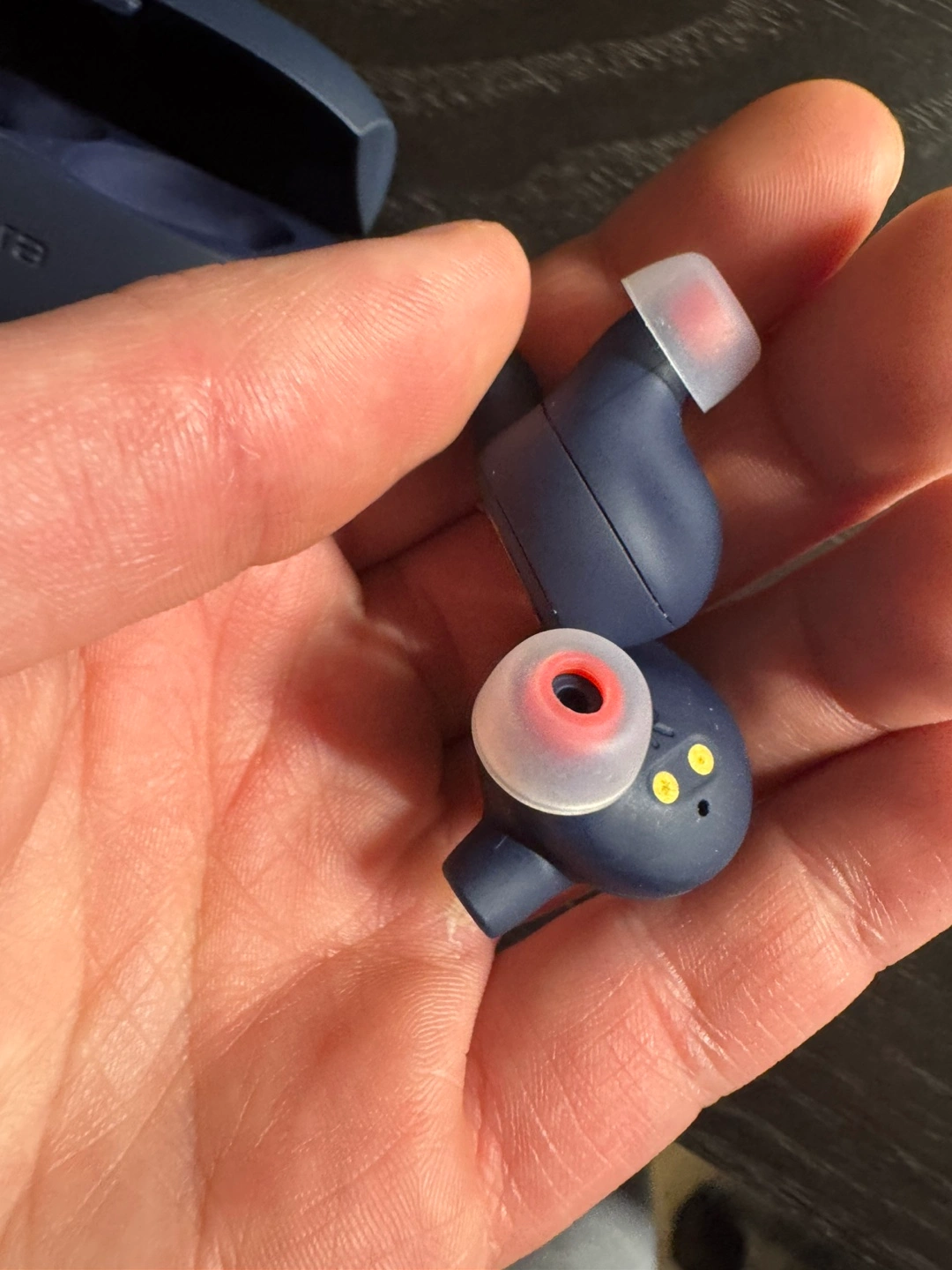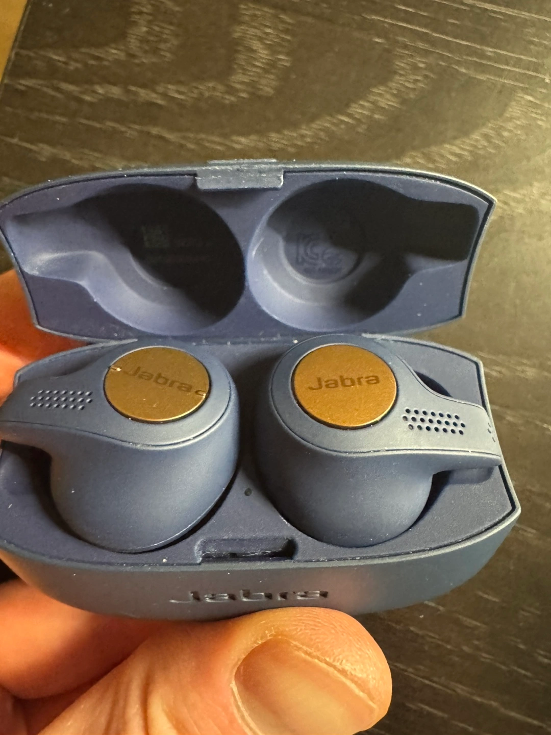 Wireless earbuds. Navy blue colour. Charging case included. Good condition.