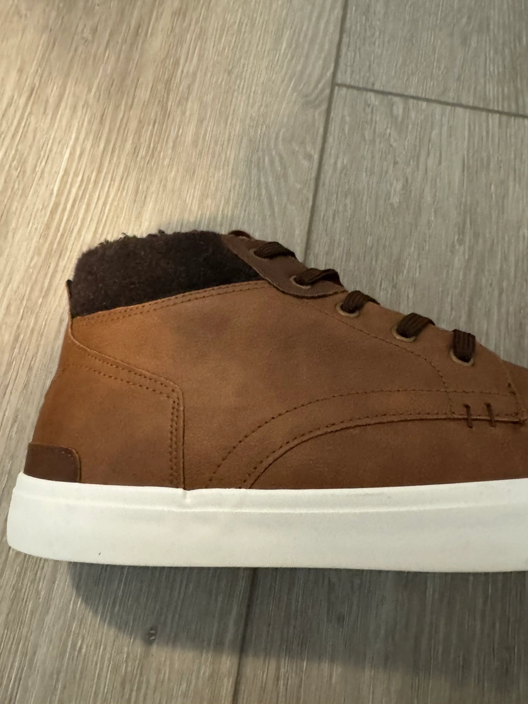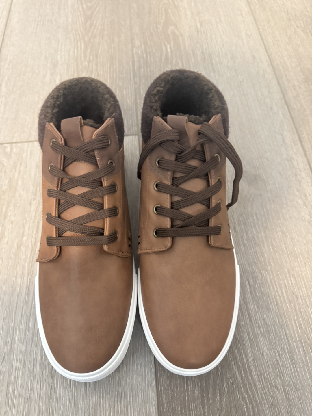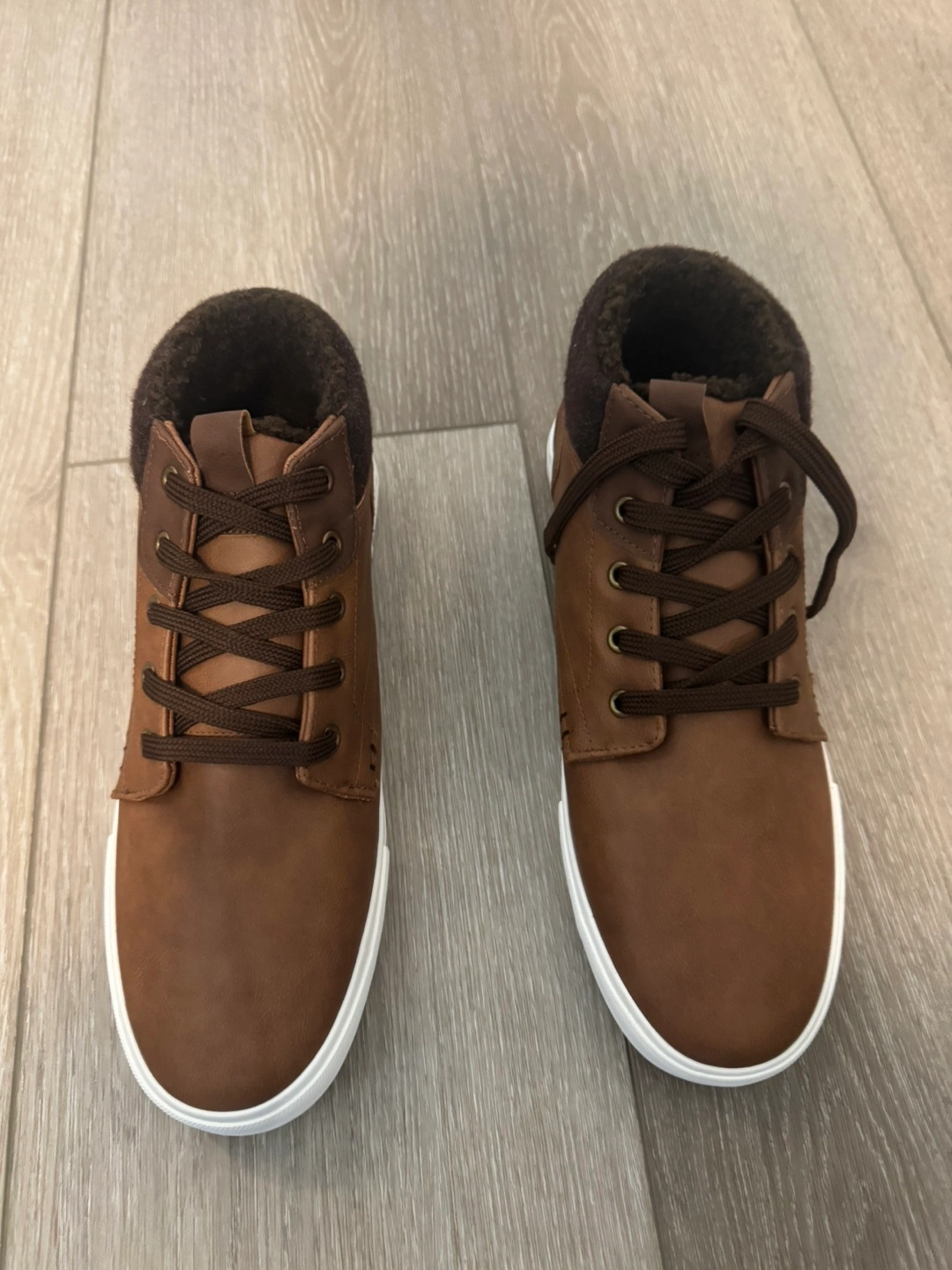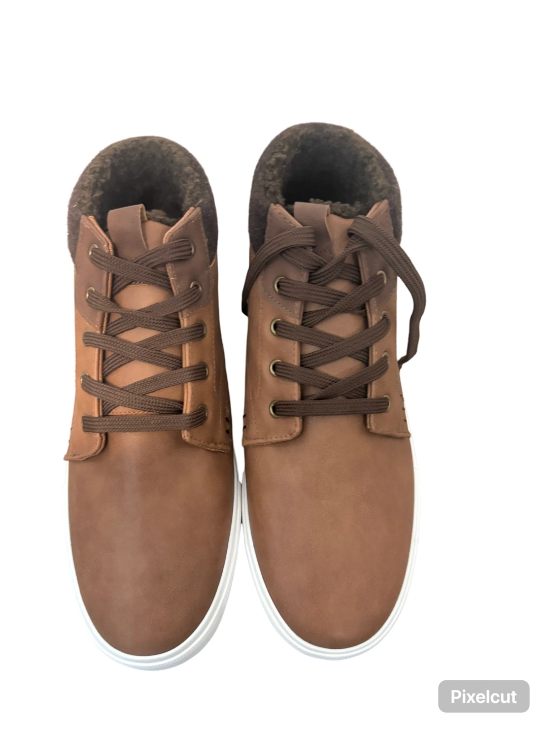 Brown faux leather high-top sneakers. Brown laces. Features a warm, brown faux fur interior. White rubber sole. Casual style, great for colder weather.