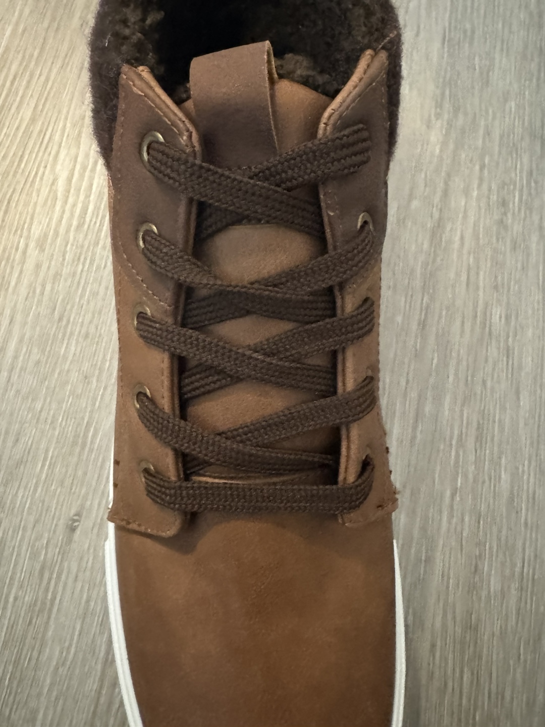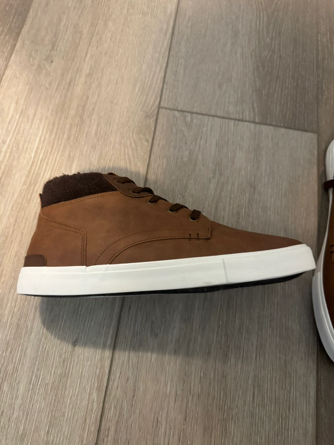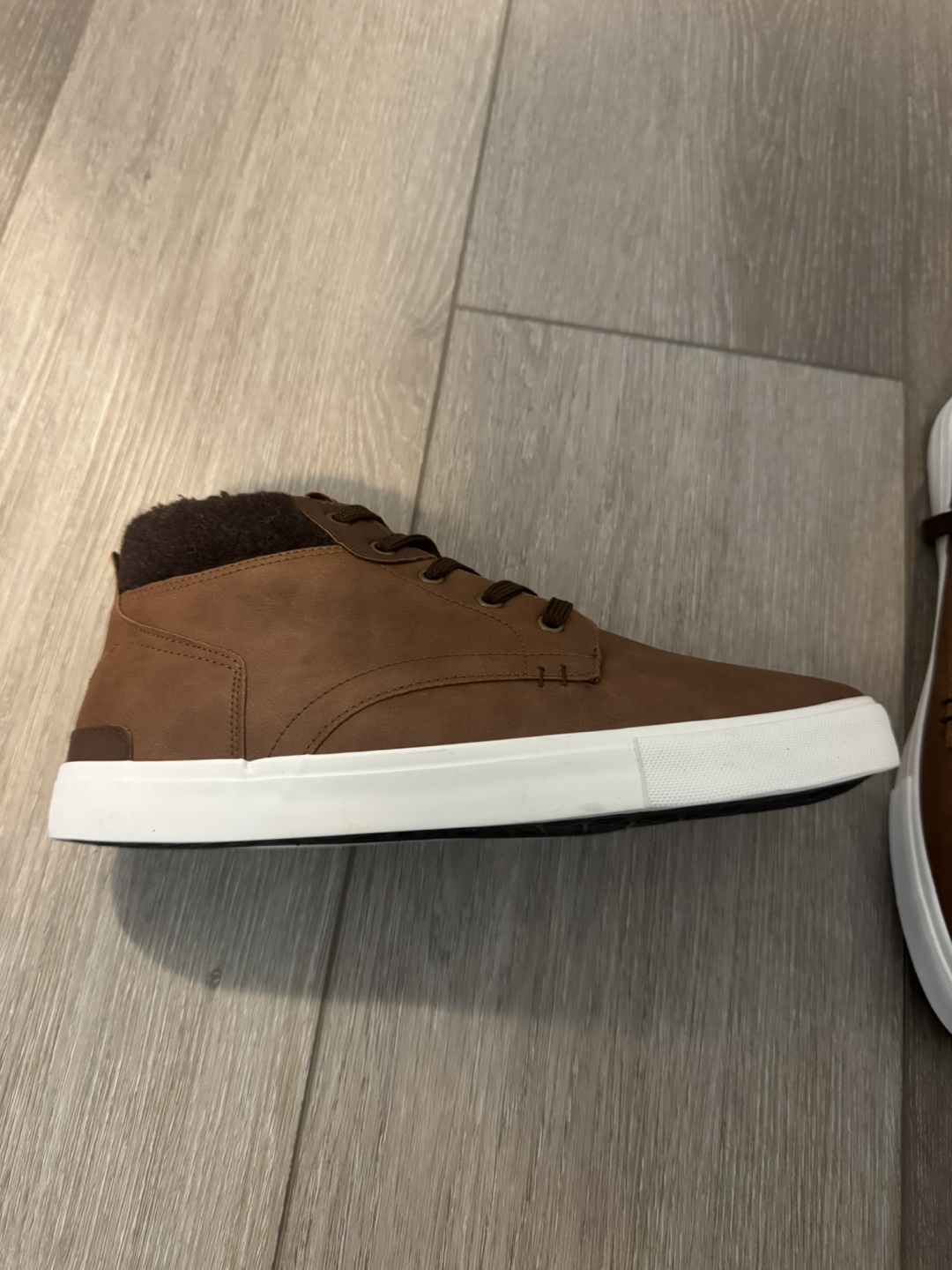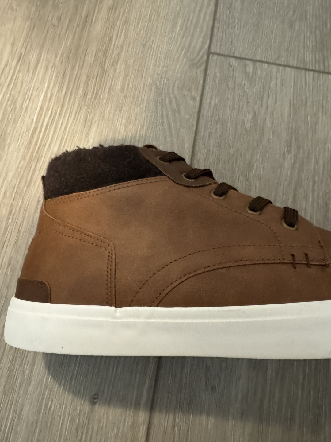 Brown faux leather high-top sneakers. Brown laces. Features a warm, brown faux fur interior. White rubber sole. Casual style, great for colder weather.