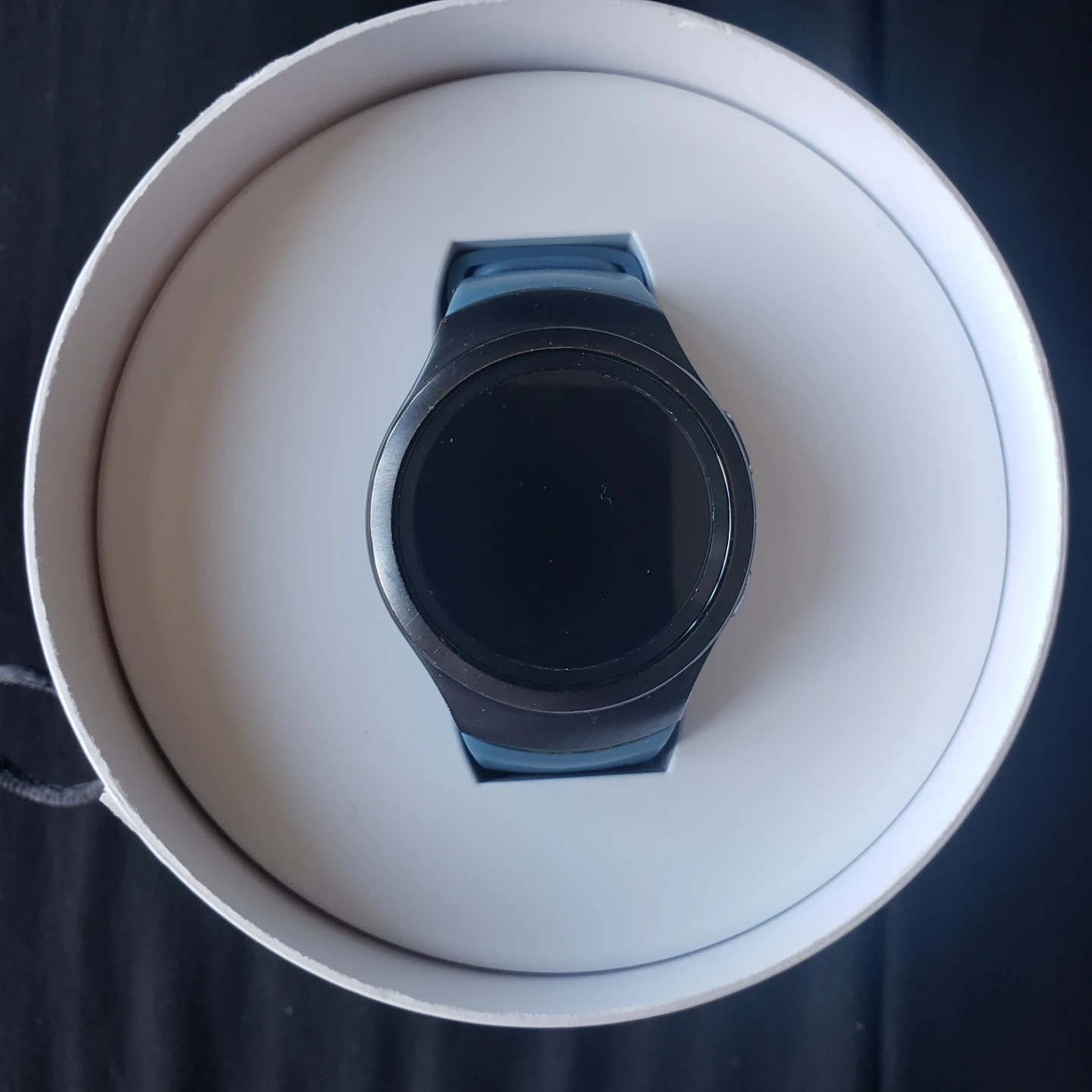 Samsung Gear S2 smartwatch. Features a circular display. Includes a wireless charging pad and extra band. Water resistant. Bluetooth and Wi-Fi enabled.