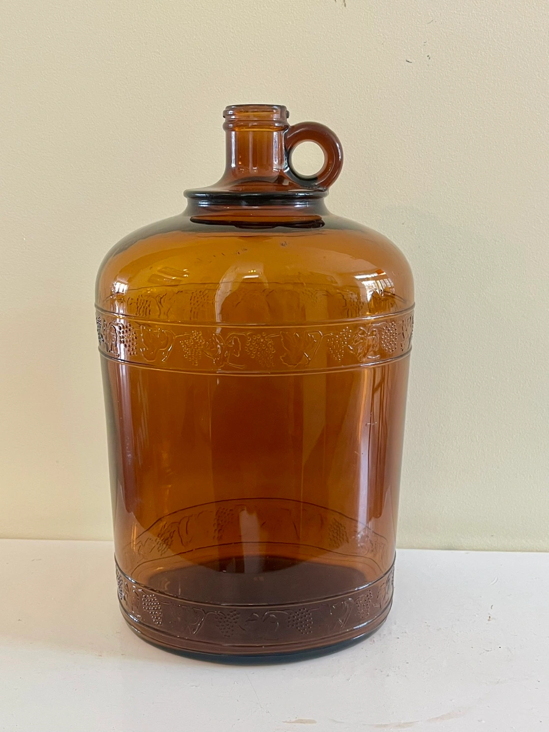 This is a vintage amber-coloured glass jug, likely from the 1950s, featuring a grape pattern and a handle, perfect for adding a touch of retro charm to your home or collection. This jug was made in Canada by Dominion Glass Company (later known as Domglas Ltd.) This jug has a gallon capacity and is in good condition for its age.