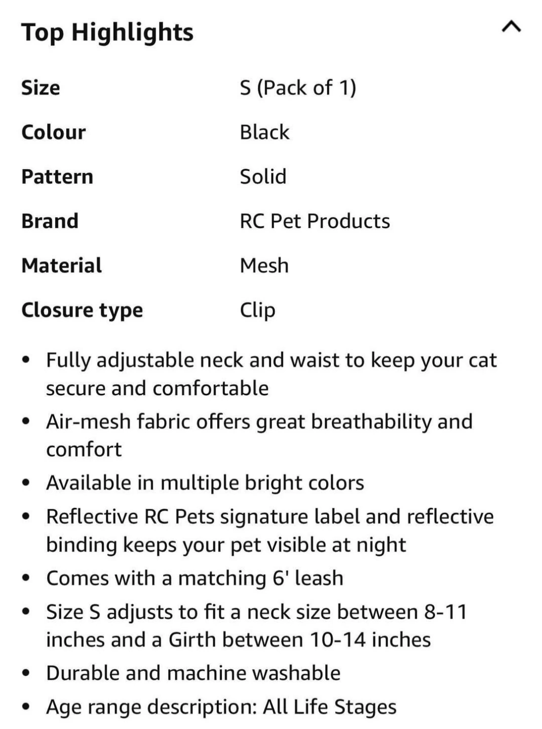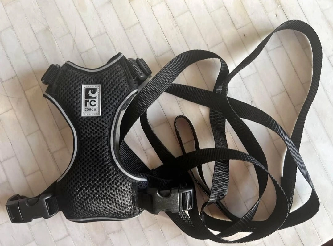 Black cat harness and leash set. Size small. Air-mesh fabric. Fully adjustable neck and waist. Reflective details. Includes 6' leash. Machine washable. It is new, my cat it didn't fit my chubby cat