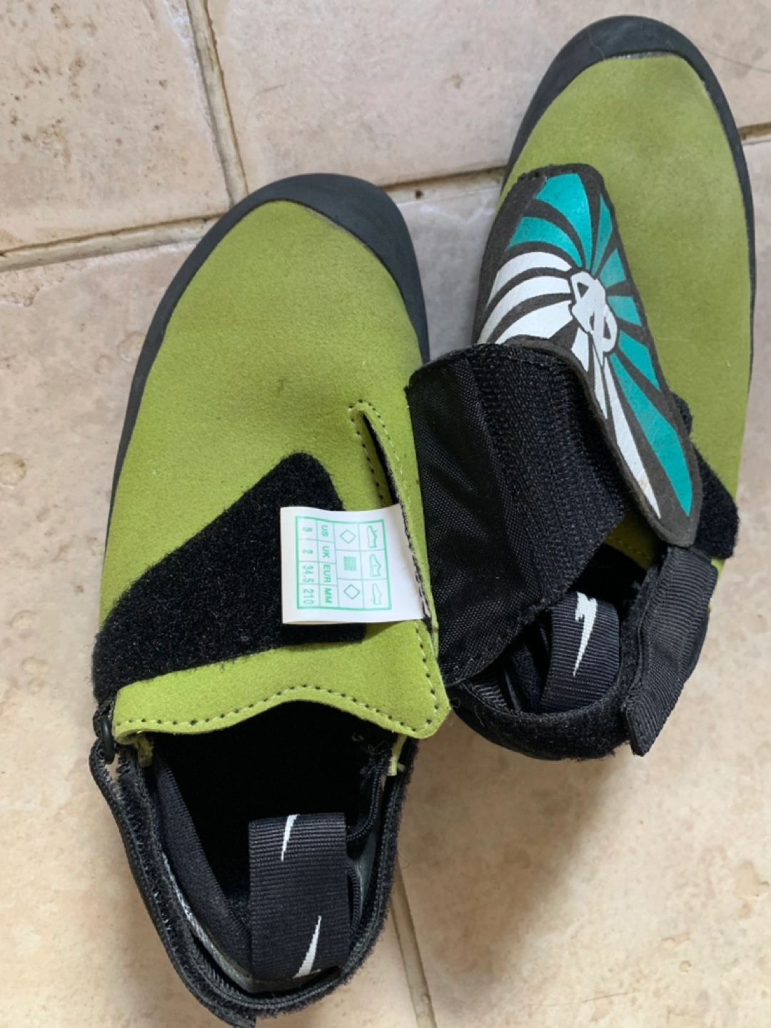Never Used Evolv Viper climbing shoes. Lime green and black. Velcro closure. Size US 3, UK 2, EUR 34,5.Good for bouldering or indoor climbing.