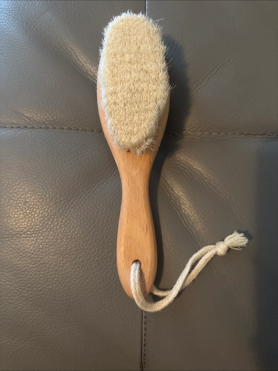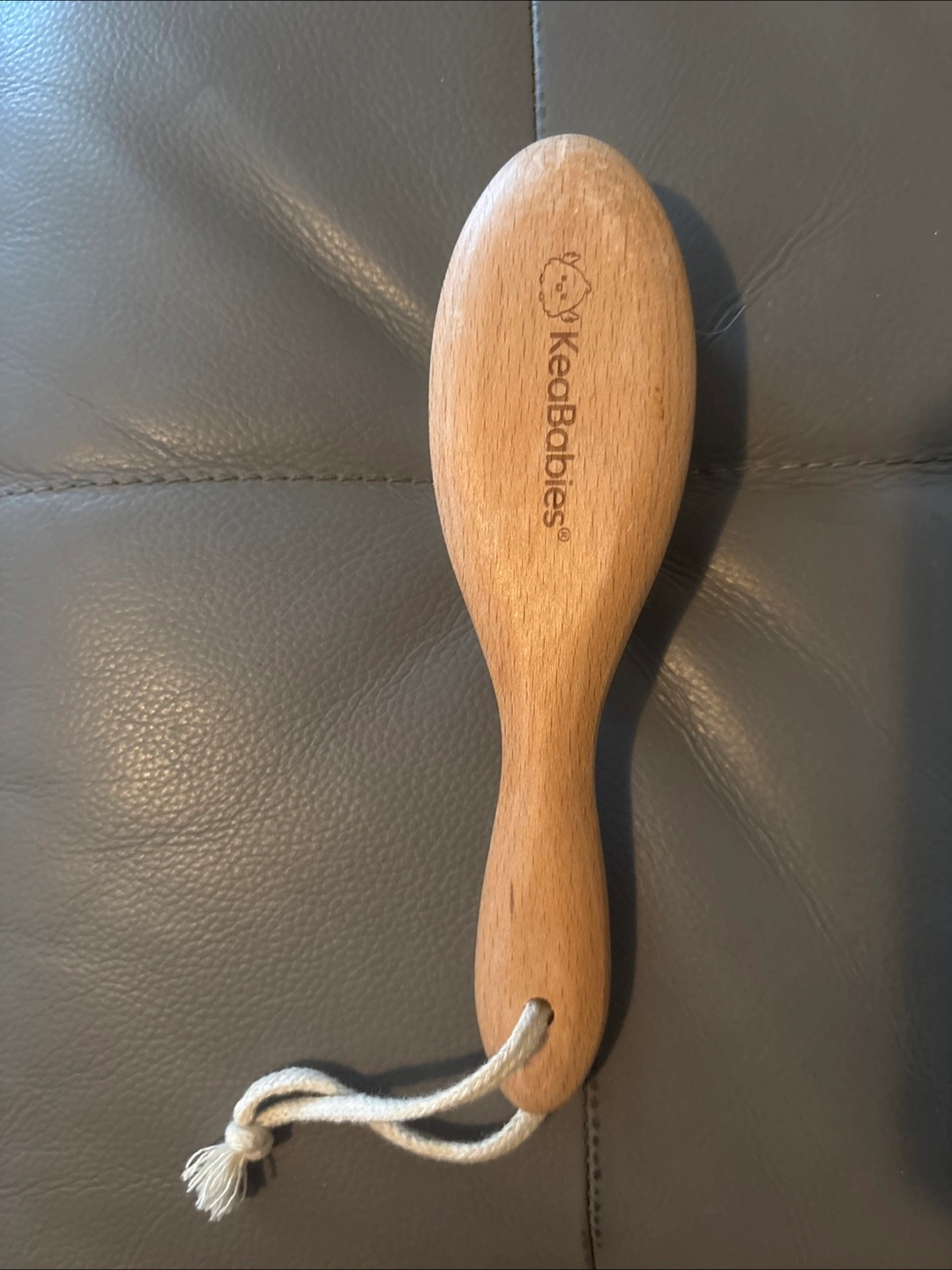 Adorable little wooden hairbrush. Soft bristles. Perfect for baby's delicate hair. Comes with a handy little string for hanging. Never used, my baby’s hair was too thick. He mostly played with it haha.