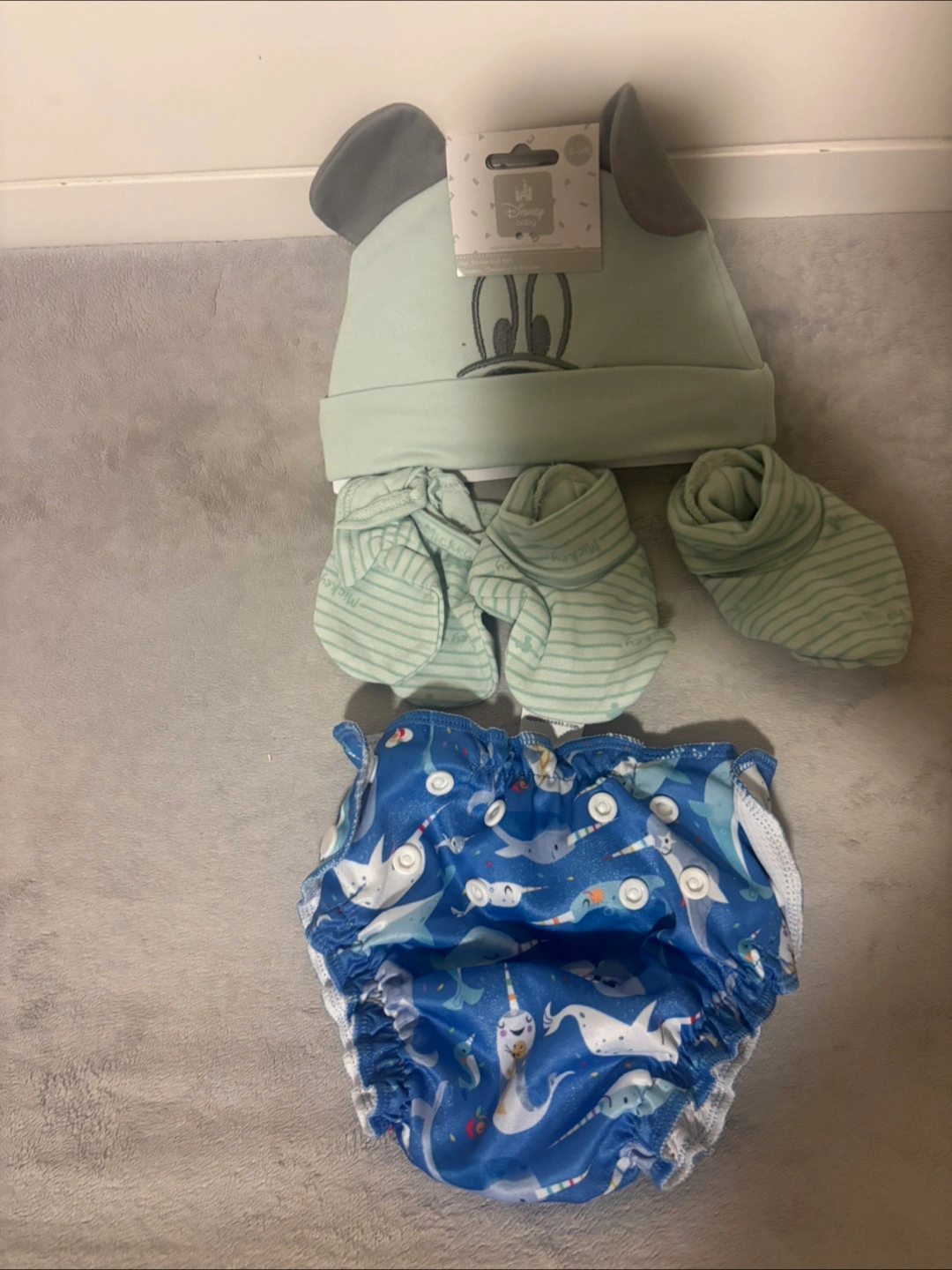 Adorable baby bundle includes one reusable cloth diaper cover featuring narwhals and other sea creatures. Also includes a cute Mickey Mouse hat and a pair of baby mittens. Perfect for a newborn.