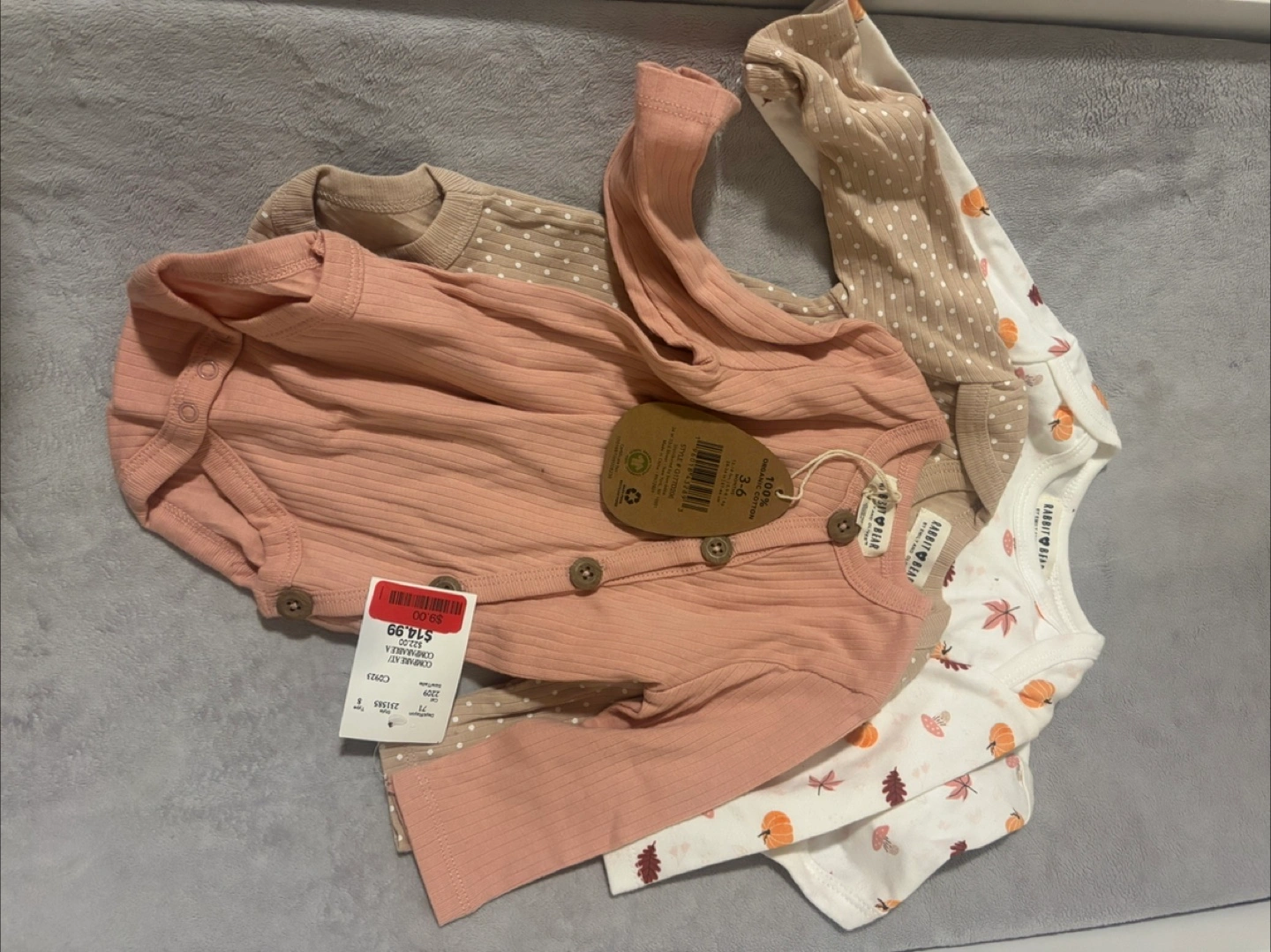 Three long-sleeve baby bodysuits. One pink ribbed bodysuit, one beige polka dot bodysuit, and one white bodysuit with autumnal print. 100% organic cotton. Size 3-6 months.