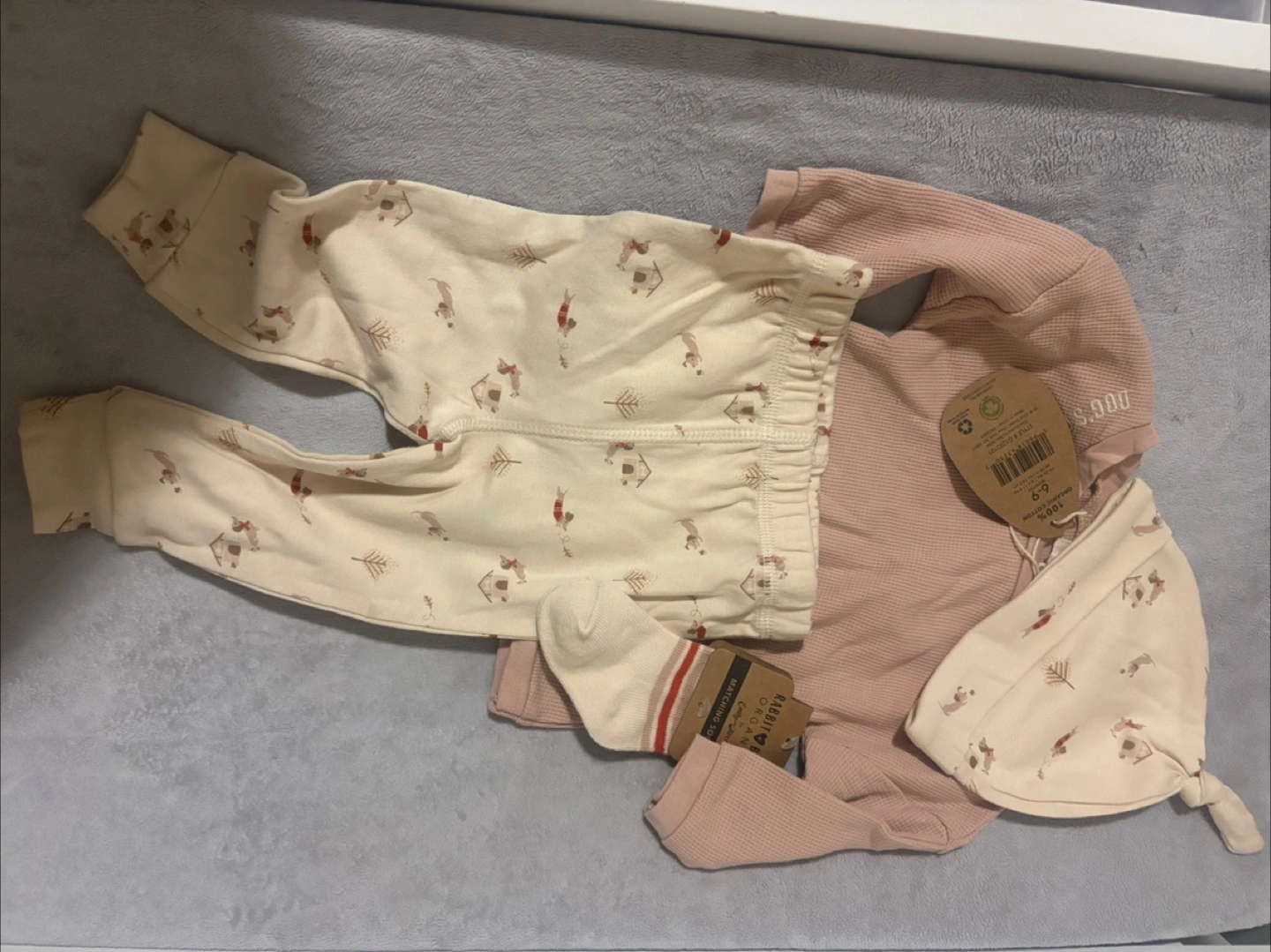 Four-piece baby outfit. Includes cream leggings with a wintery print, a dusty rose waffle-knit long-sleeve top, and matching cream hat. Organic cotton. Size 6-9 months.