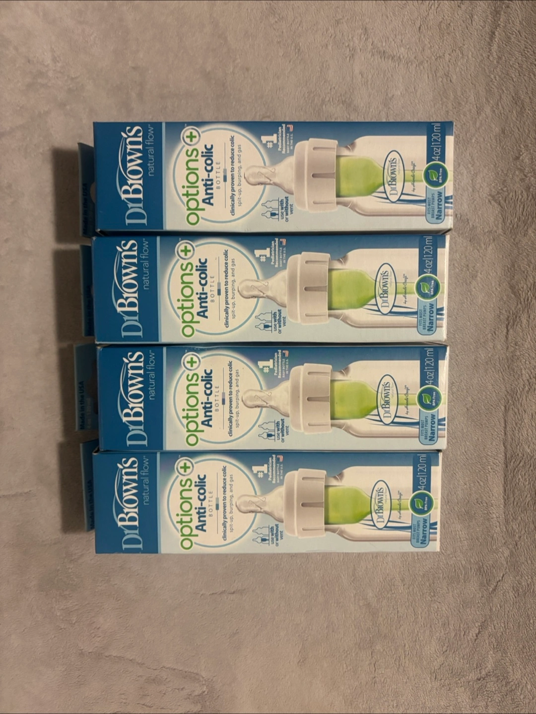 Four new, unopened Dr Brown's Options+ Anti-Colic baby bottles. Each bottle is 4 oz/120ml with a narrow neck. Clinically proven to reduce colic, spit-up, burping and gas. Use with or without vent.