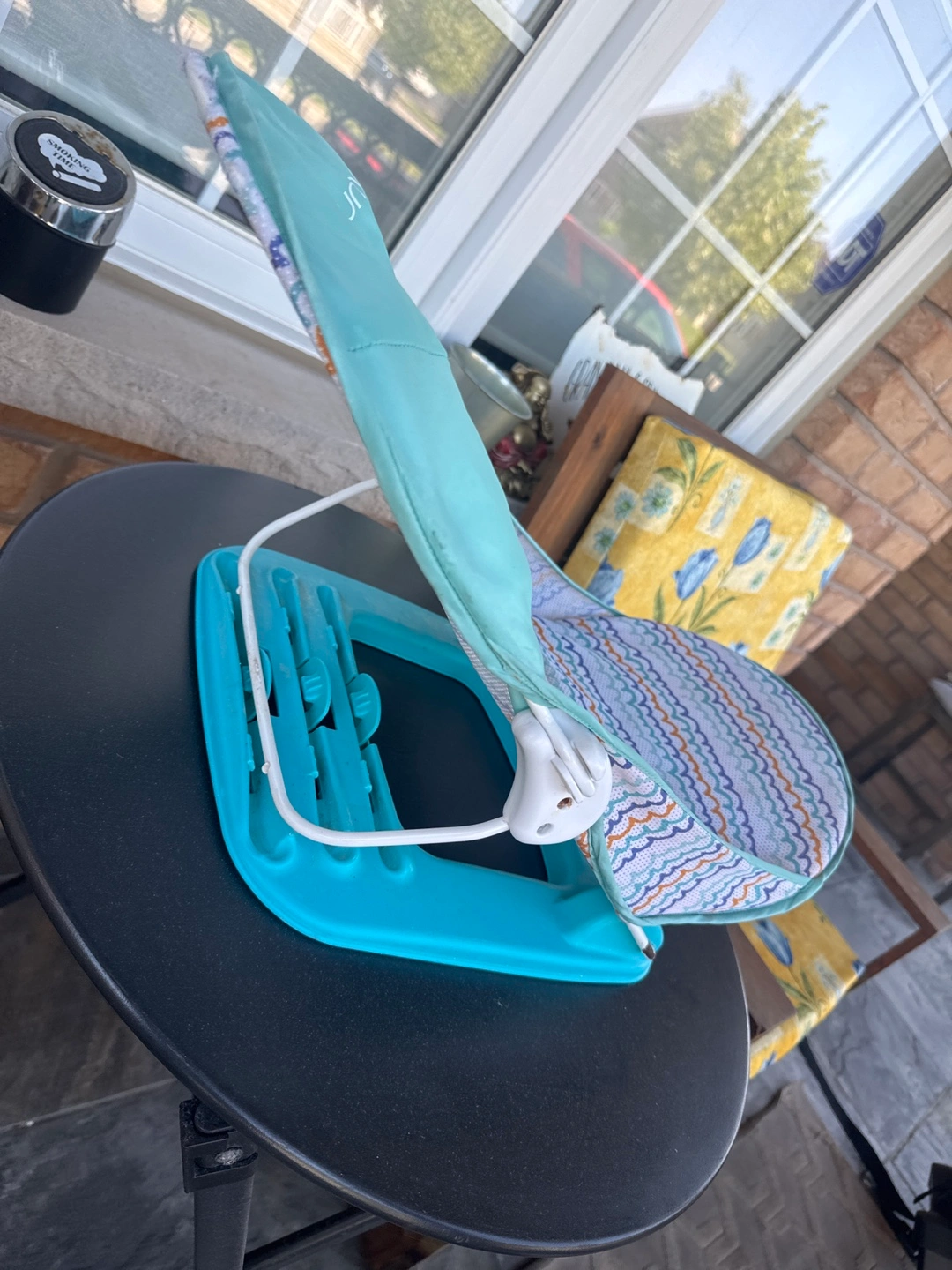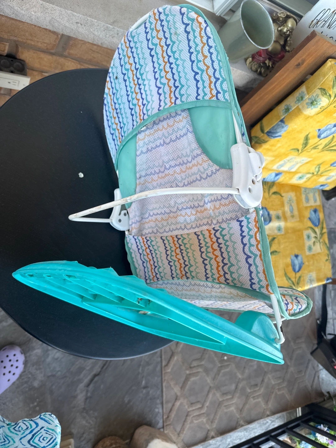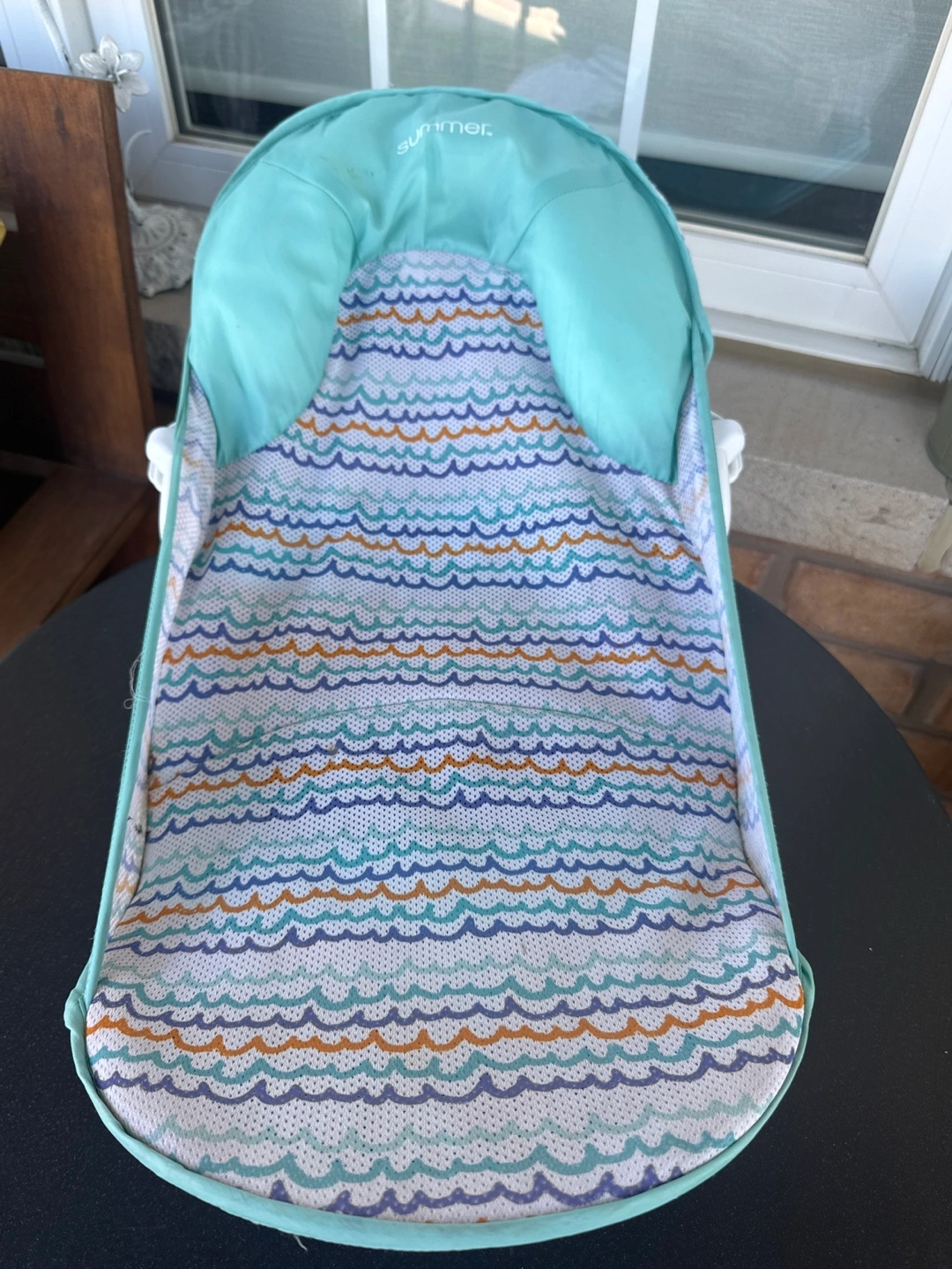 75Infant bath seat. Teal and white. Features a mesh fabric. Good used condition. Suitable for newborns.