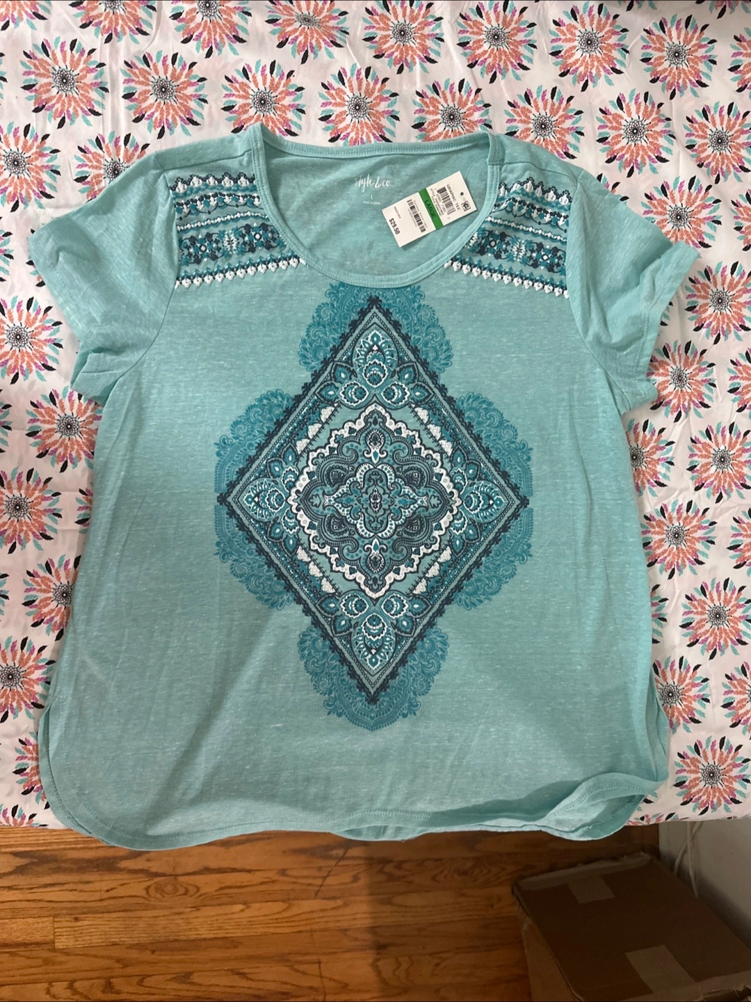 Women's teal short sleeve graphic tee. Size large. Features a unique paisley-inspired design. New with tags.