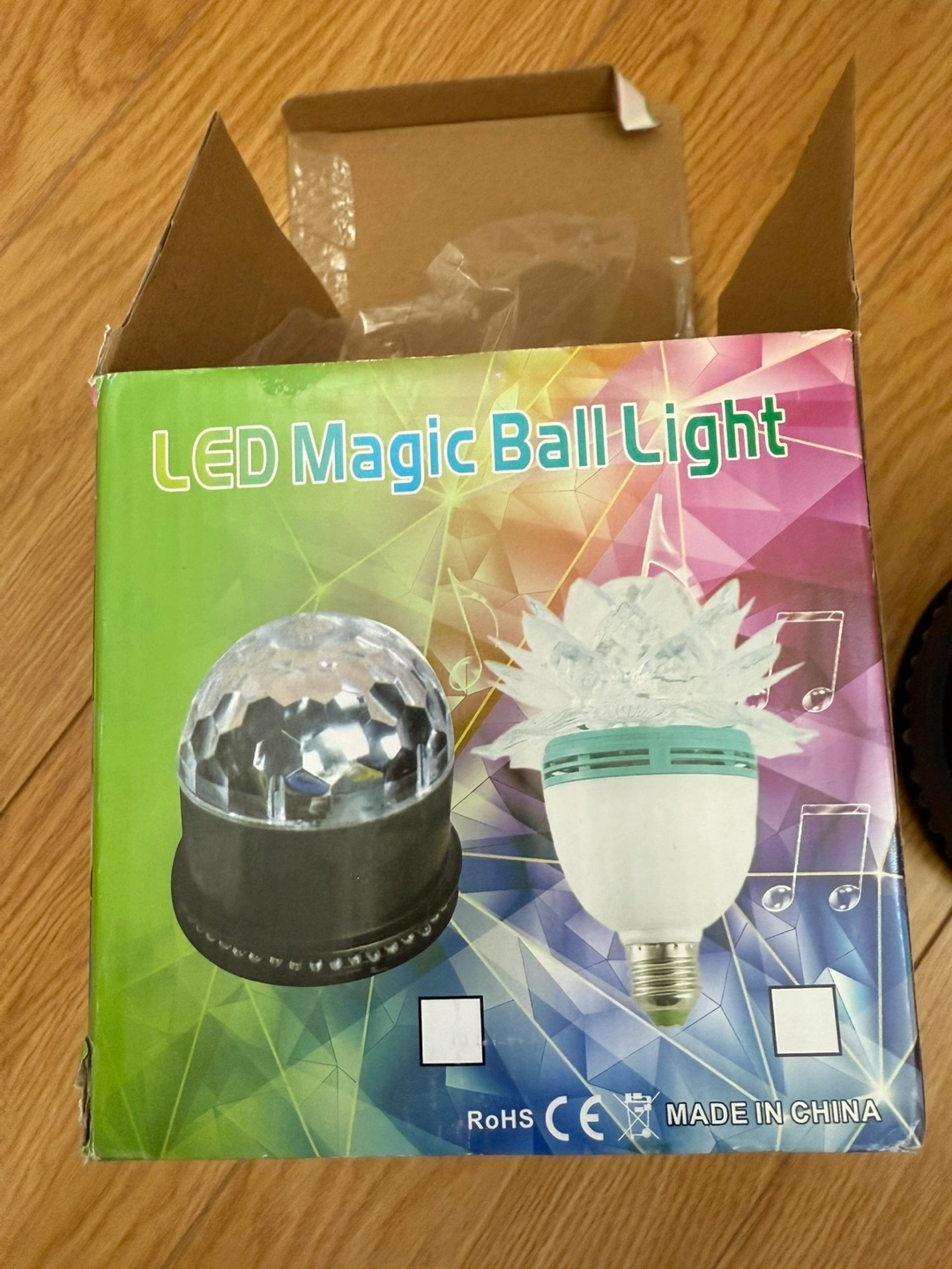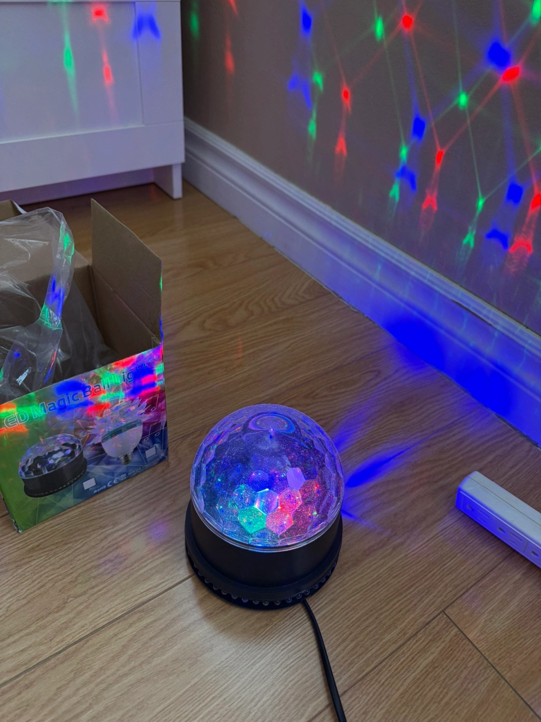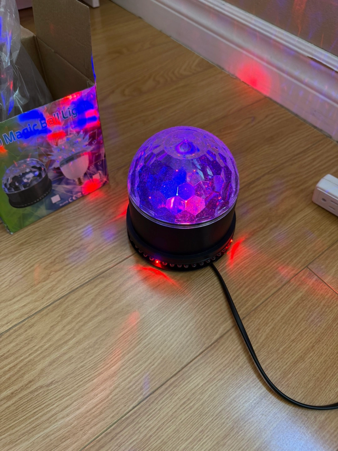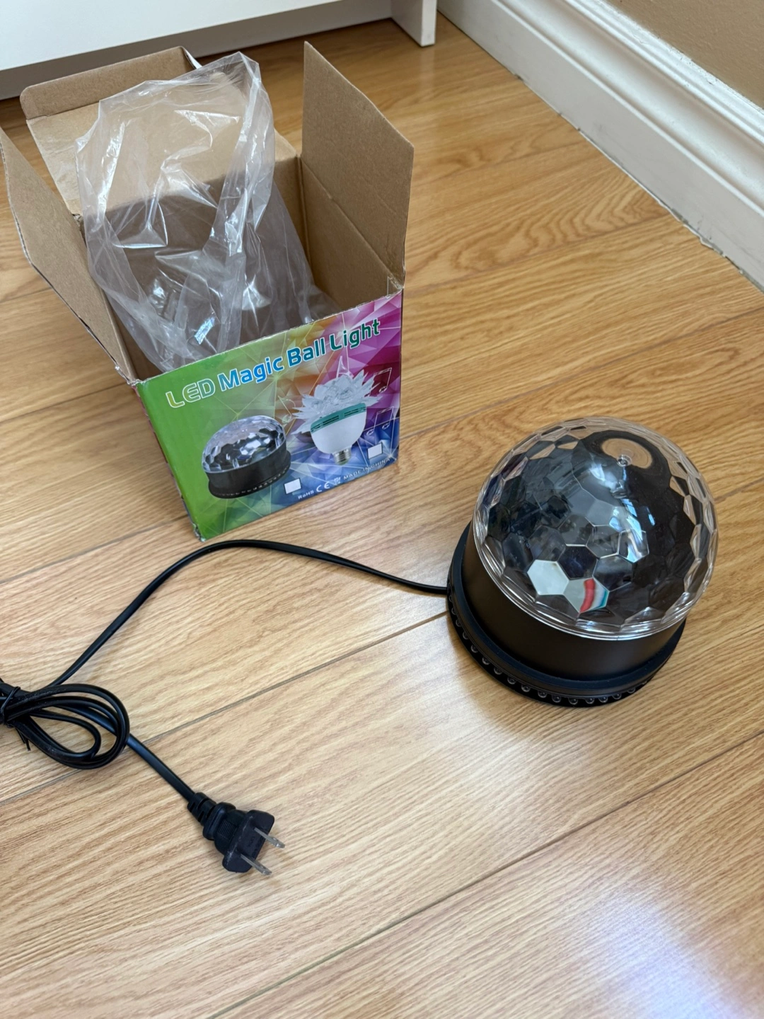 Multicoloured LED disco ball light. Projects patterns onto walls and ceilings. Includes power cord. Great for parties and events. New never used.