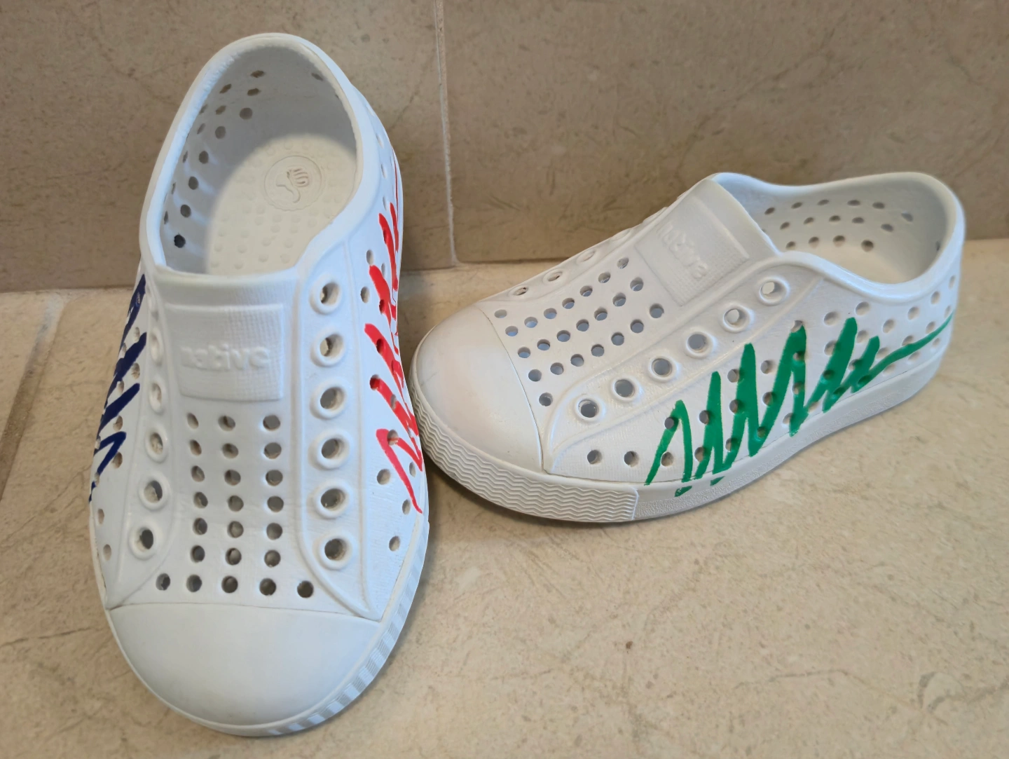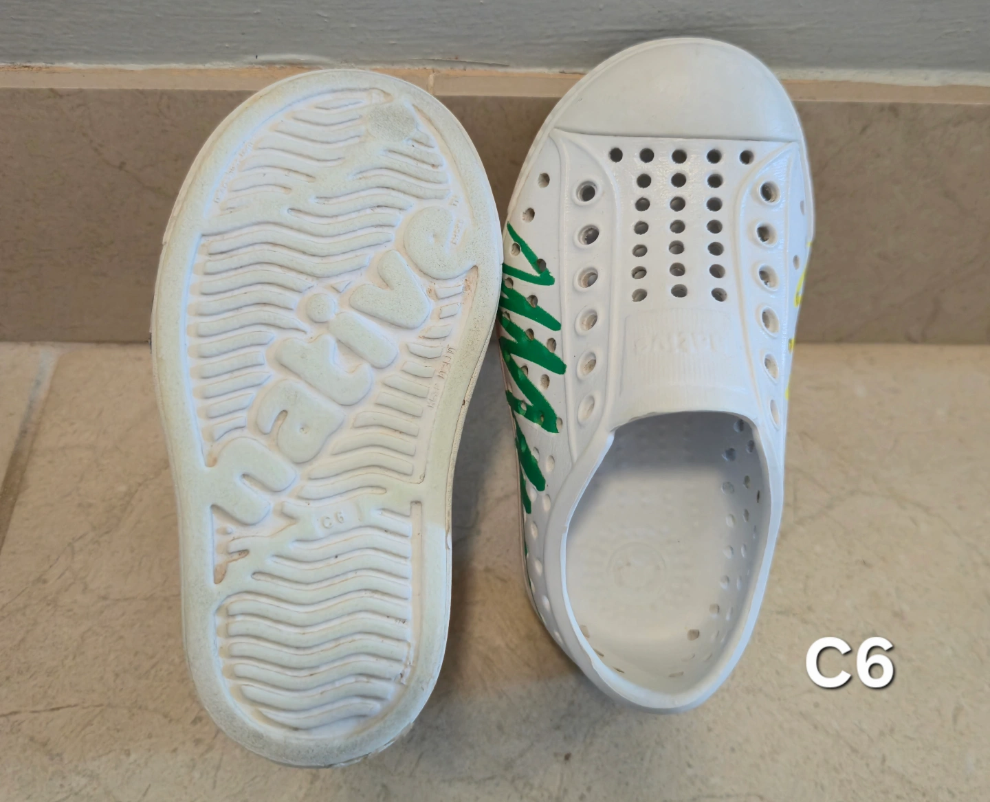 Pair of white Native Jefferson slip-on shoes. Size C6. Hand-painted designs. Pre-owned.