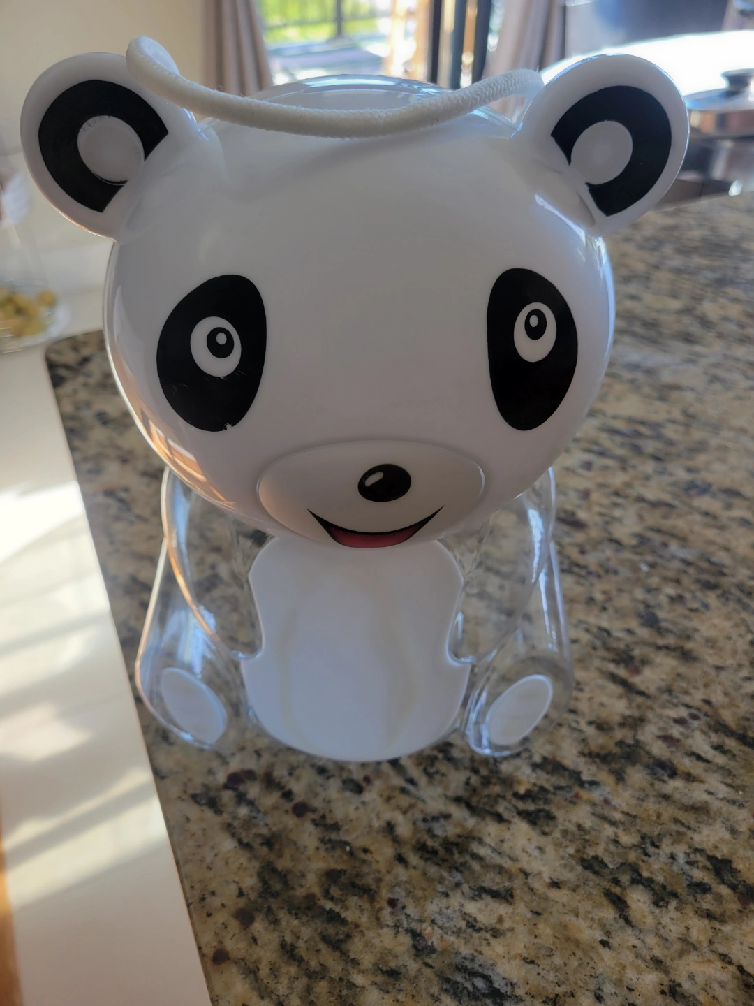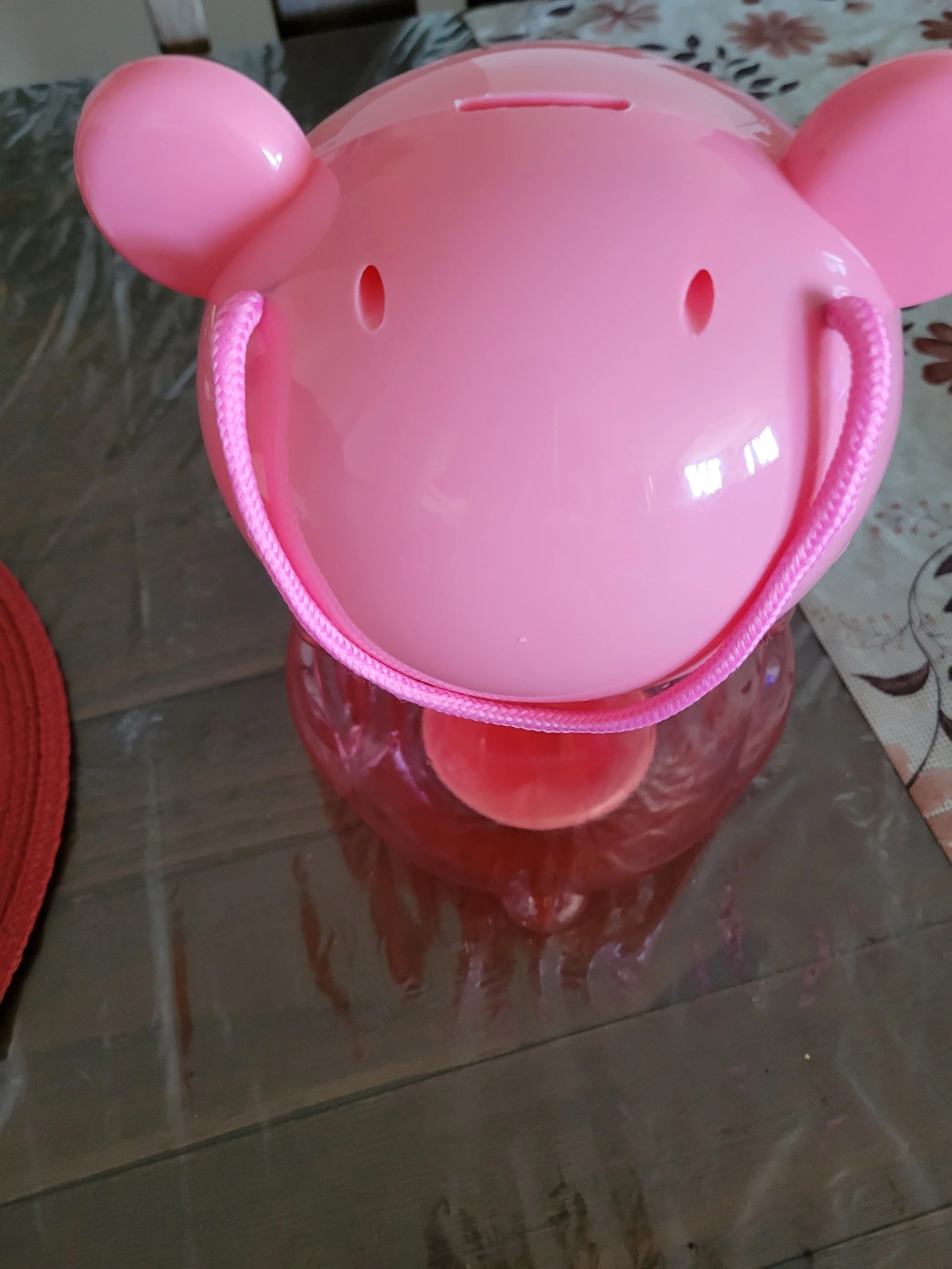 Cute Pink piggy and White Panda Bear Bank. Pink and white plastic. Features a coin slot on top and carrying handles. Perfect for children's savings.
