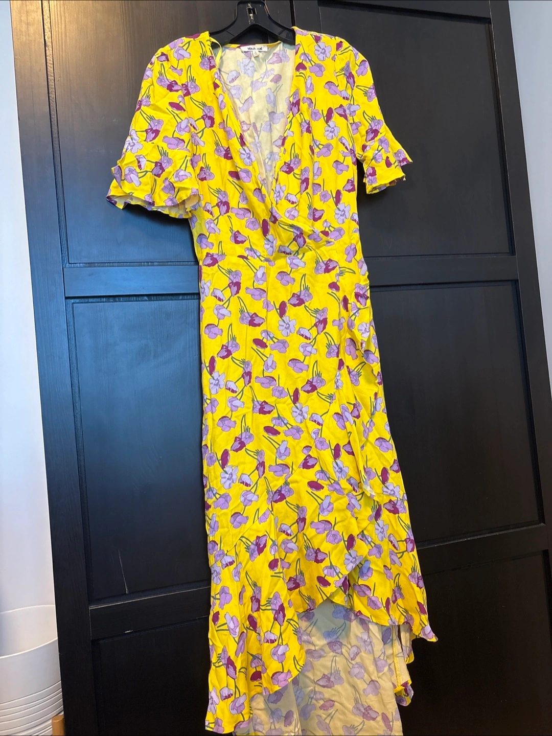 Beautiful yellow midi dress. Features short sleeves, V-neckline, and a wrap-style design. Floral print throughout. Asymmetrical hemline.