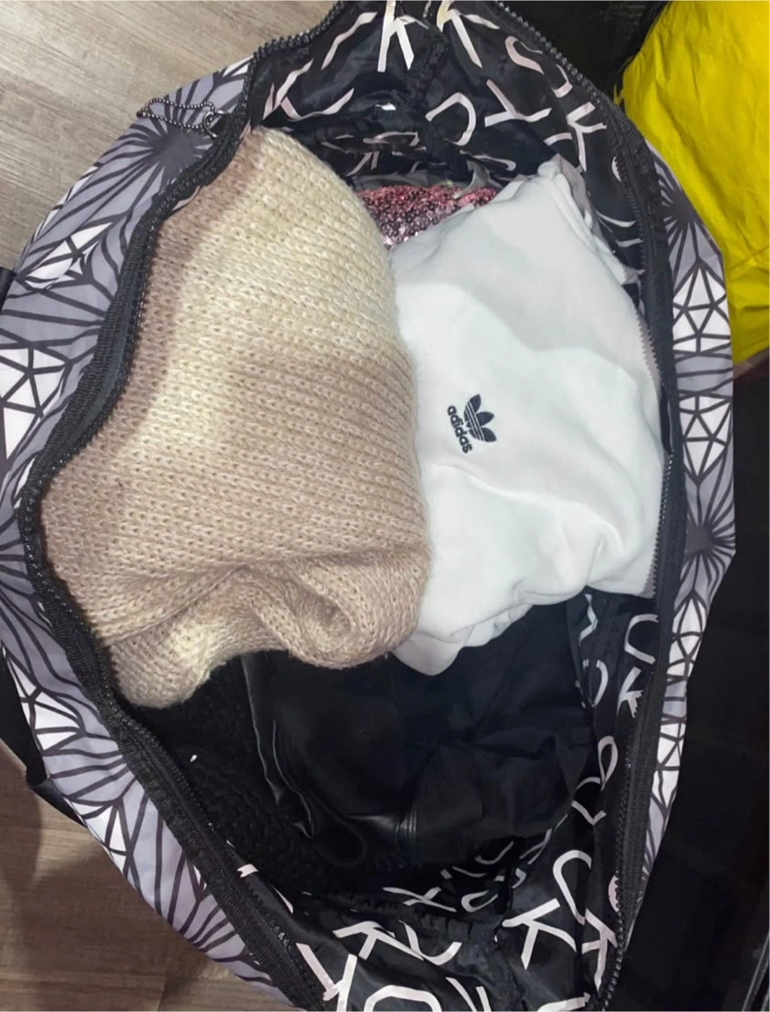 Large bag of clothes size Large and X-Large various items, such as pants, sweaters, shirts, cardigan, and knitted sweaters. With the clothes comes the large tote bage that clothes are in which is a bag with wheels and a handler like a suitcase.