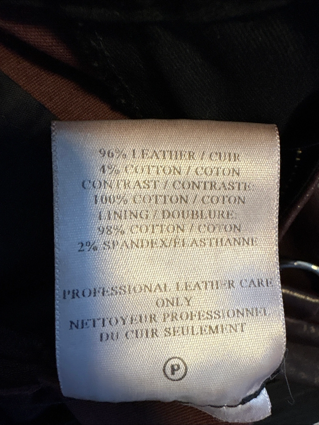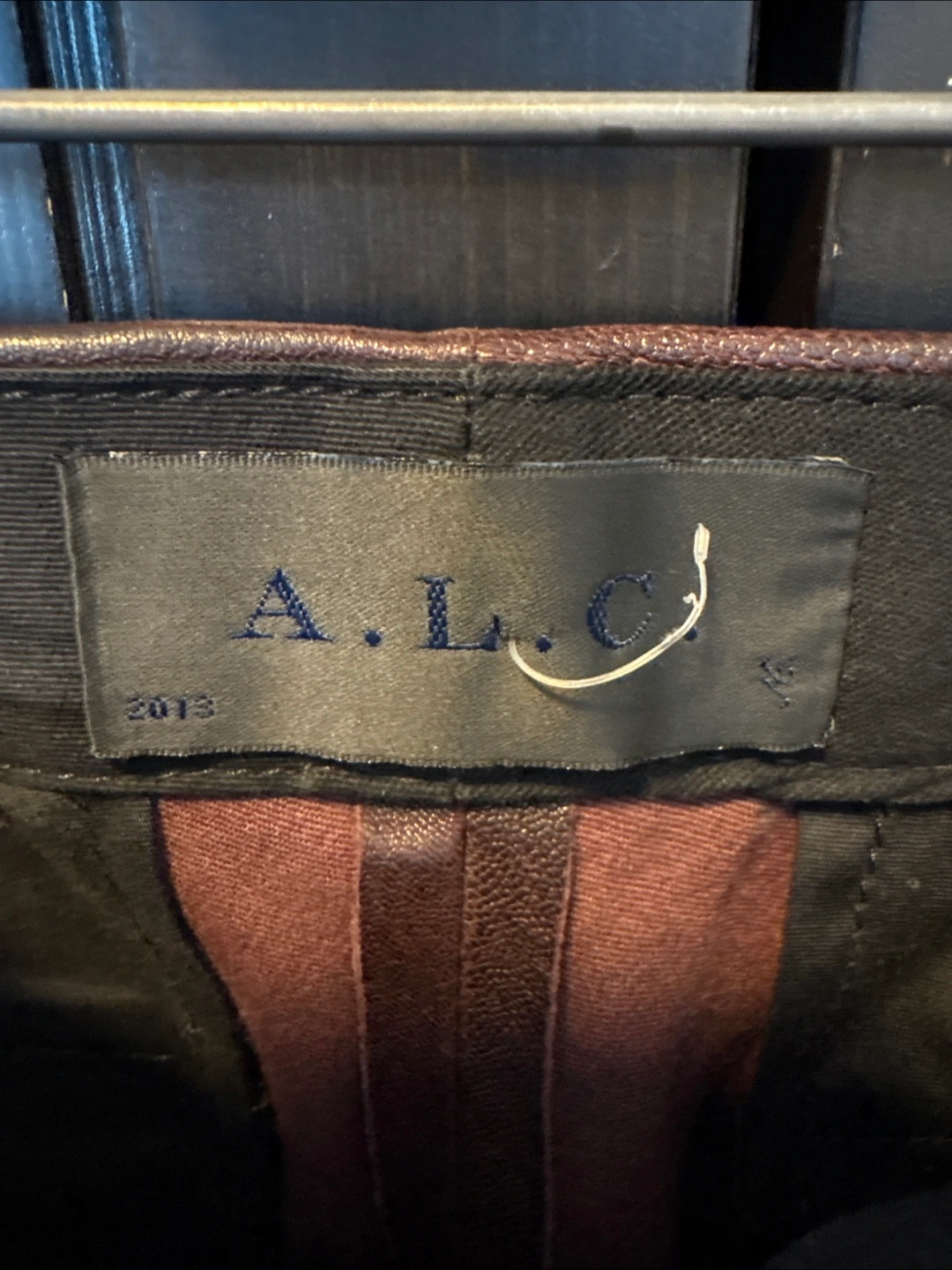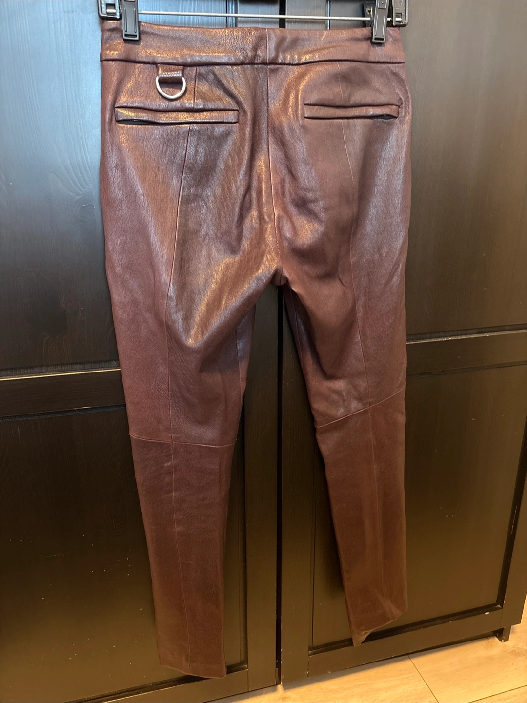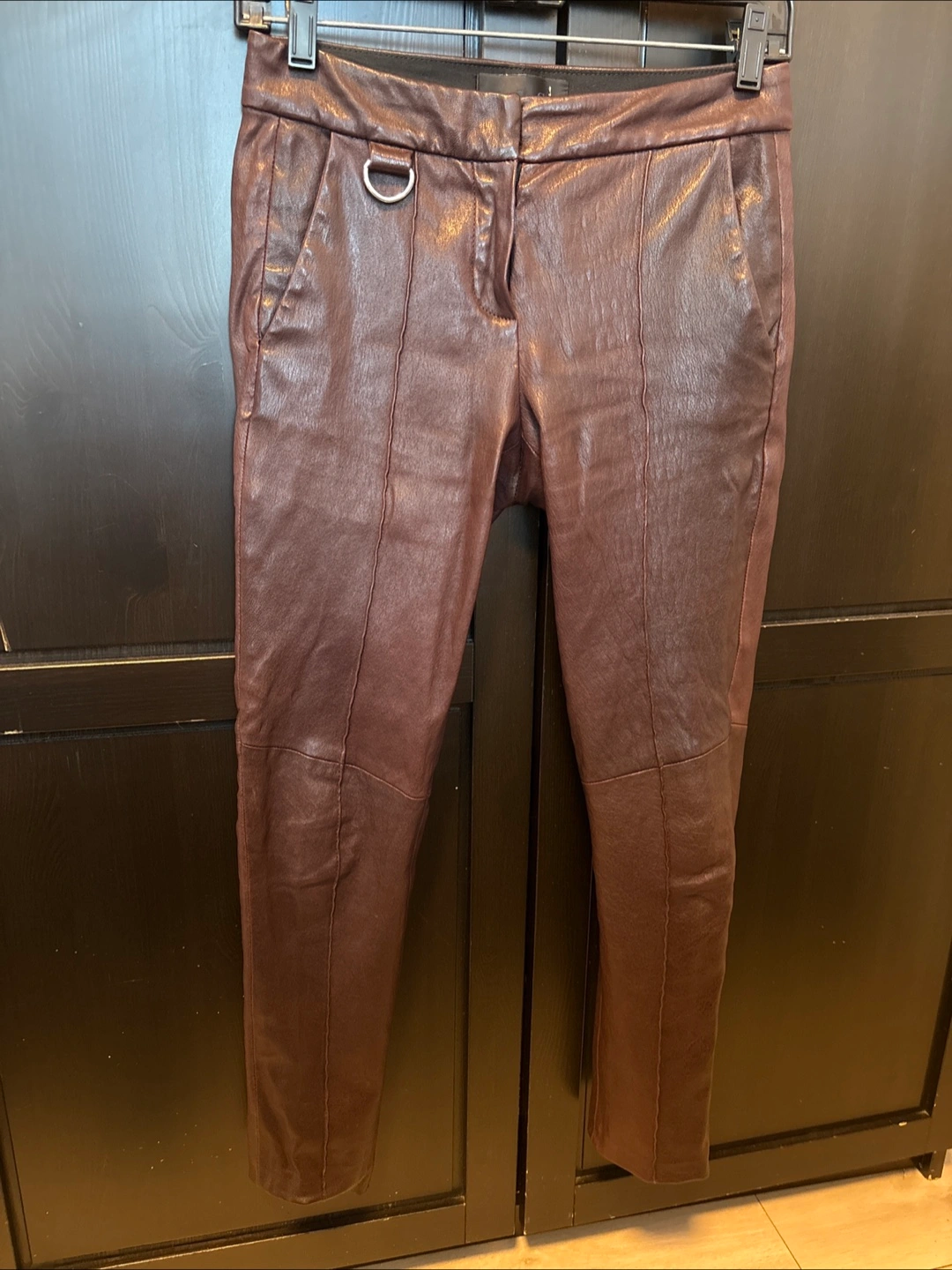 Burgundy leather pants. Size 2. Features pockets and a unique design detail at the waist. 96% leather, 4% cotton and 2% spandex. Exceptional quality. Paid over $700