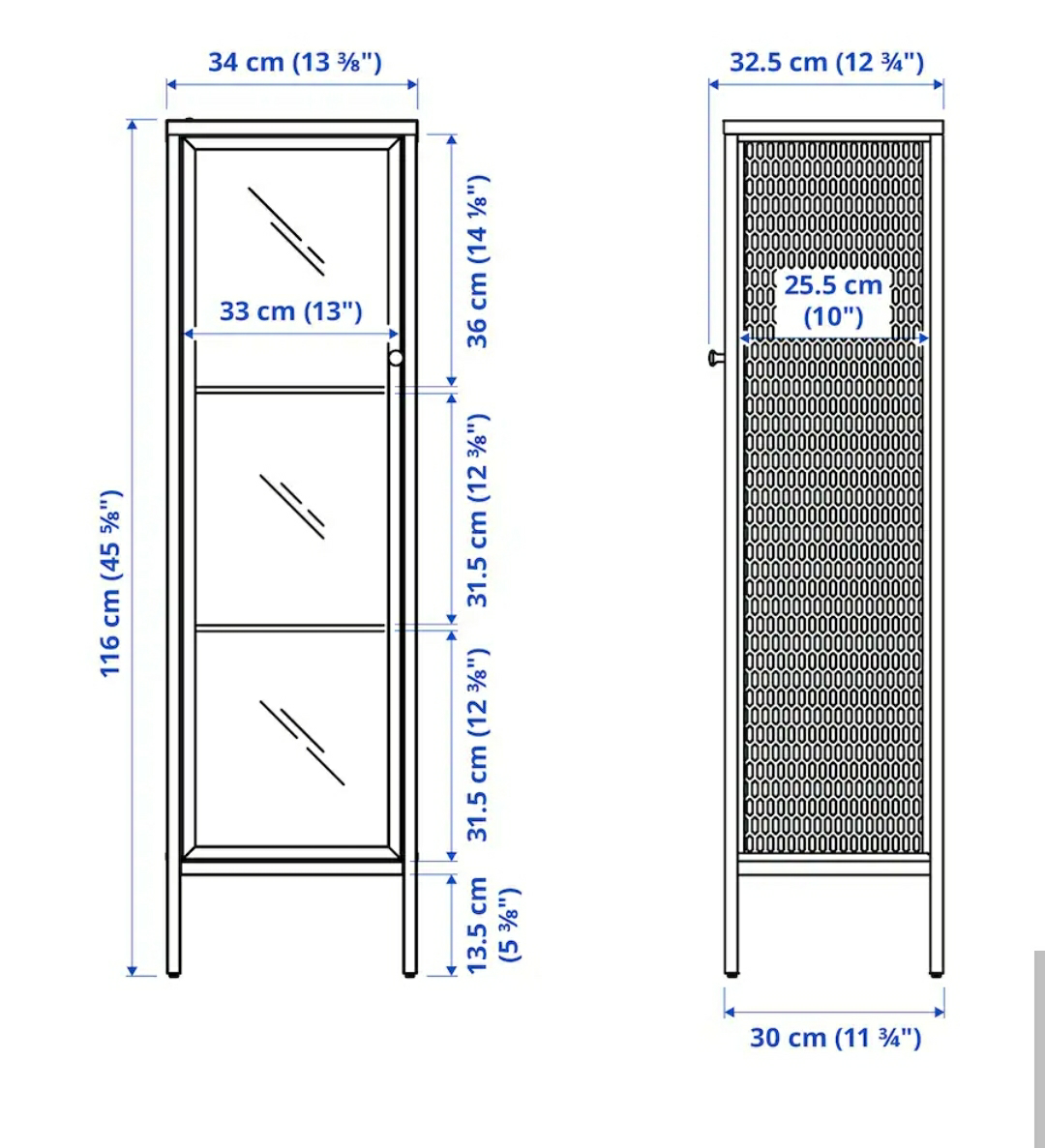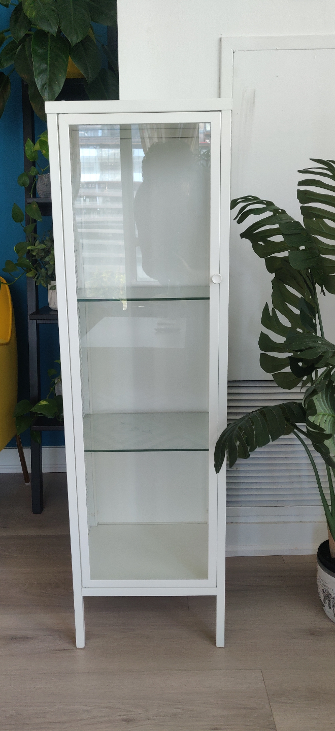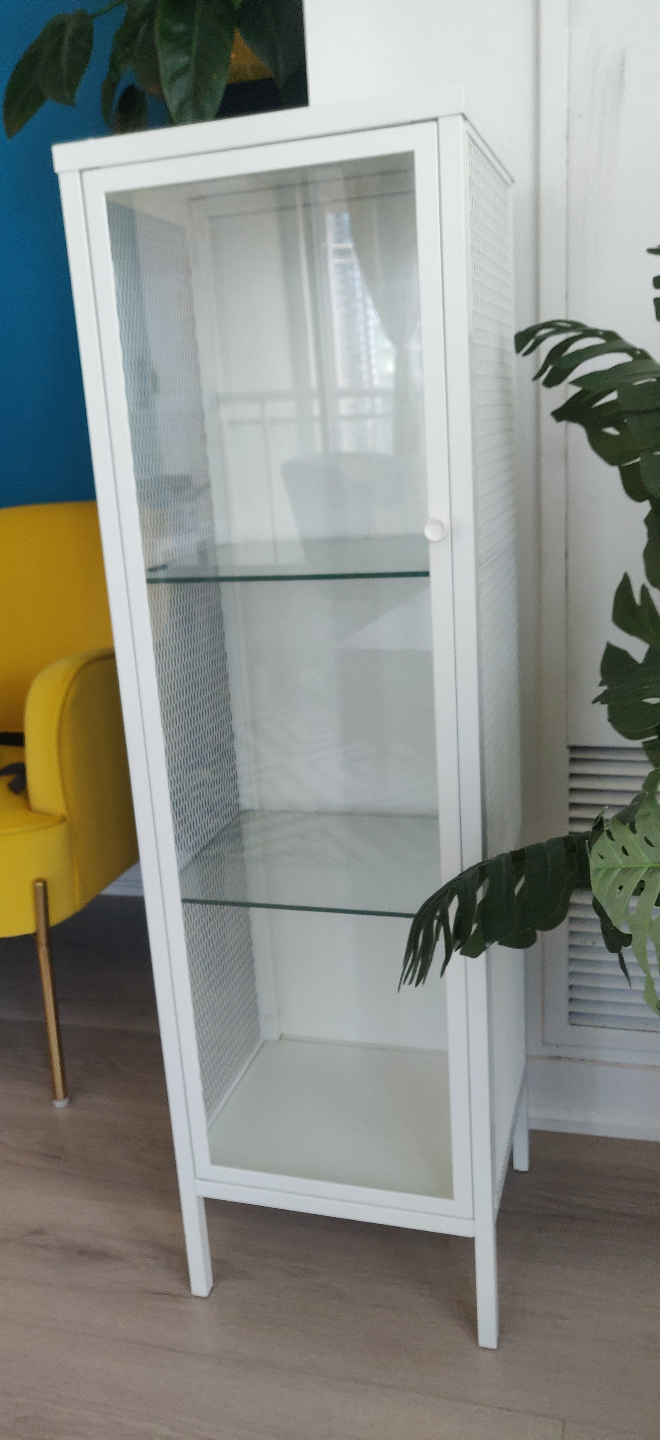 Freestanding cabinet. White metal frame. Glass door and shelves. Two glass shelves. Ideal for displaying collectibles or storing items.