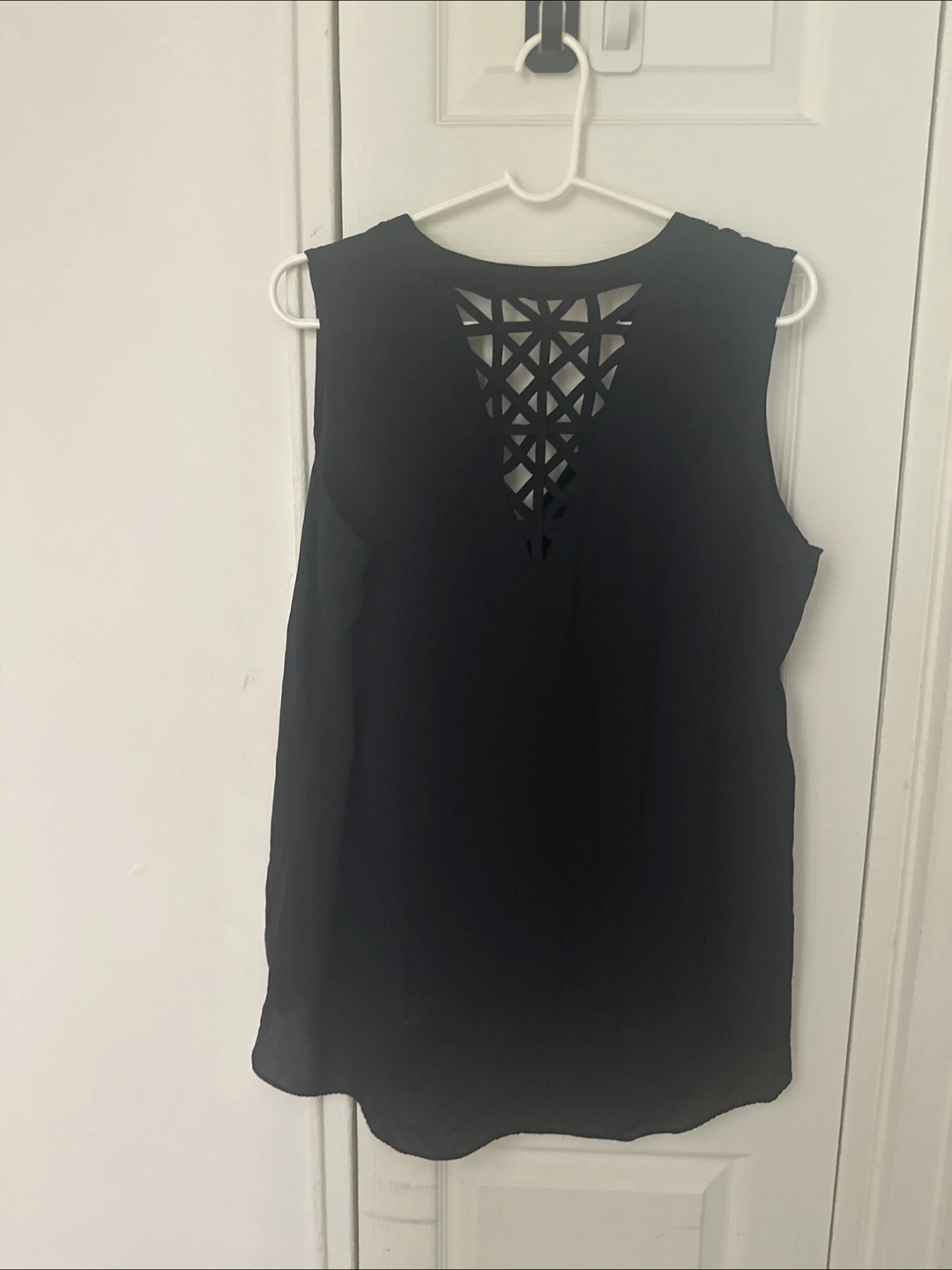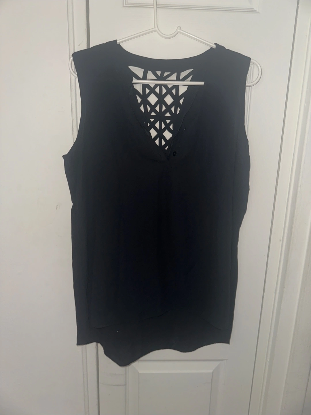 Women's sleeveless top. Black. Cutout geometric detail on the back. V-neck. Flowy material. Simple and elegant.
