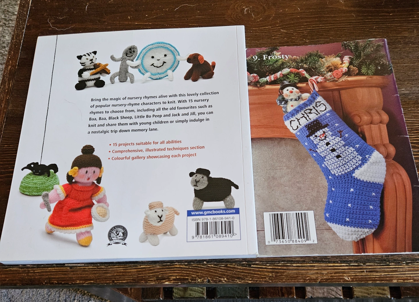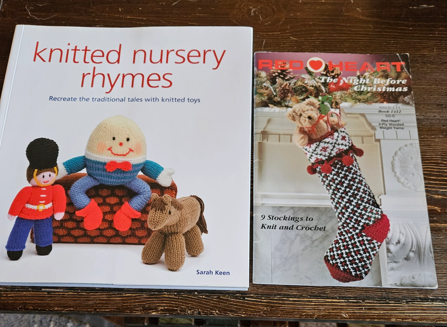 Two knitting pattern books. One features nursery rhyme characters. The other has nine Christmas stocking patterns. Both books are in good condition. Canadian pricing sticker visible. $10 for both.