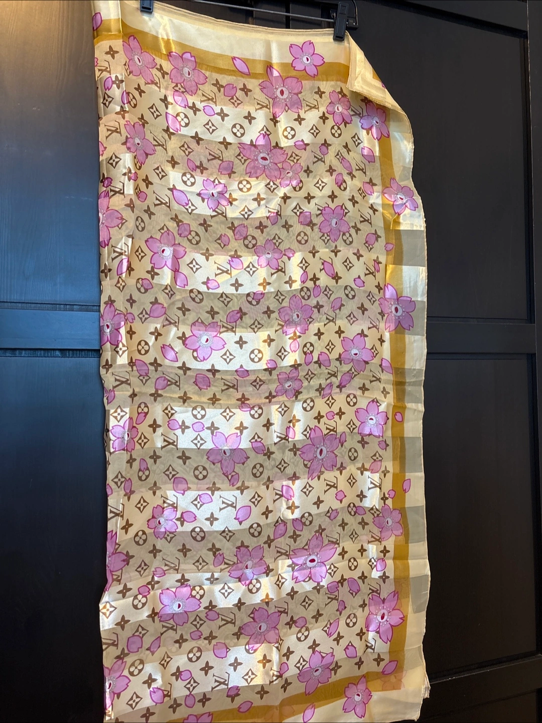 Beautiful scarf. Features a buttery yellow and brown LV-inspired pattern with pink cherry blossoms. Soft and luxurious feel. Perfect accessory for any occasion.