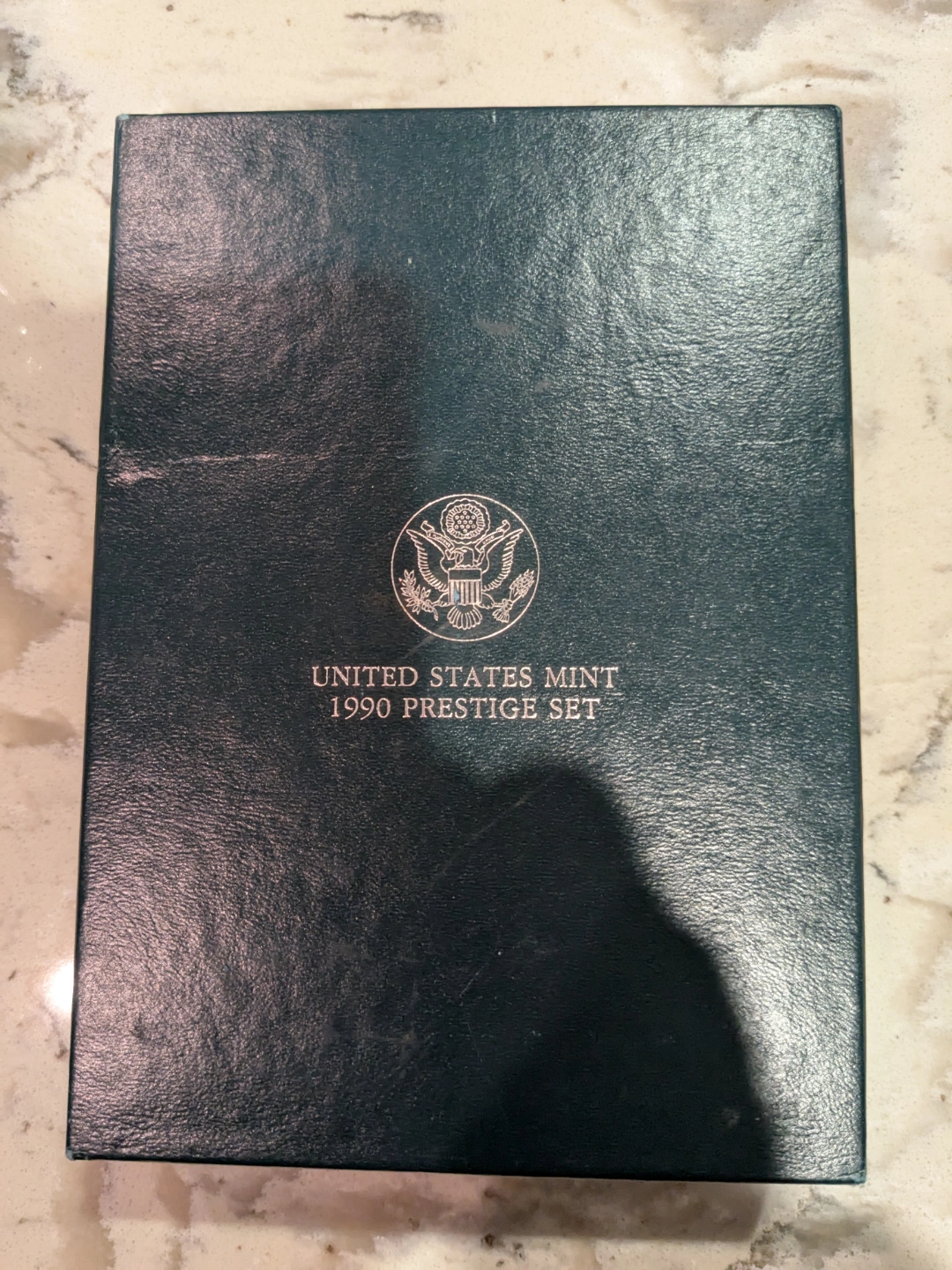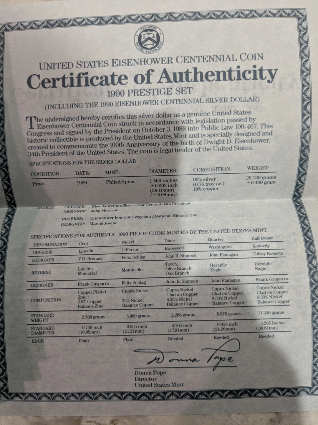Complete set of 1990 US Mint prestige proof set original and complete collection with a box and certificate of authenticity.One dollar 90% silver Eisenhower.