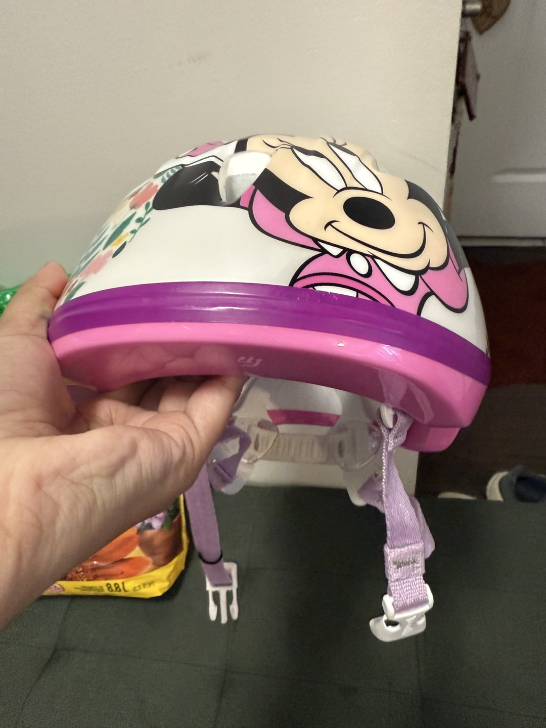 Adorable Minnie Mouse helmet. Features a pink and white design with flowers. Purple accents. Adjustable straps. Great for toddlers and young children.