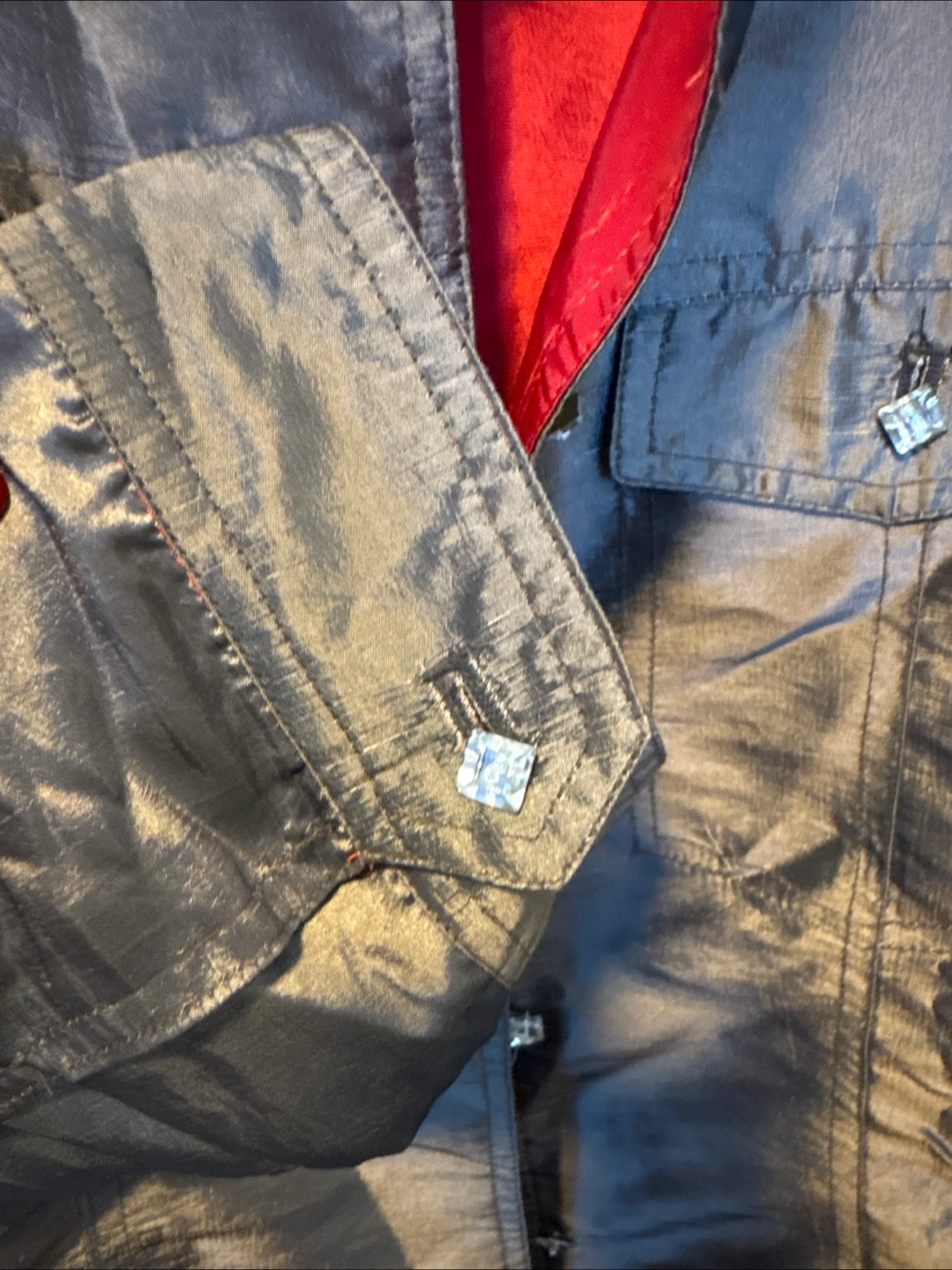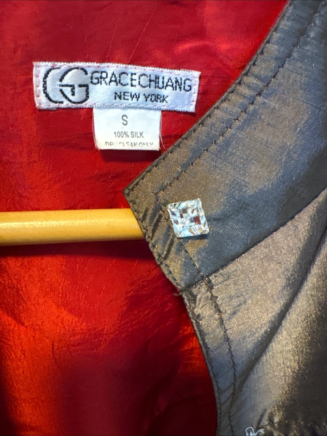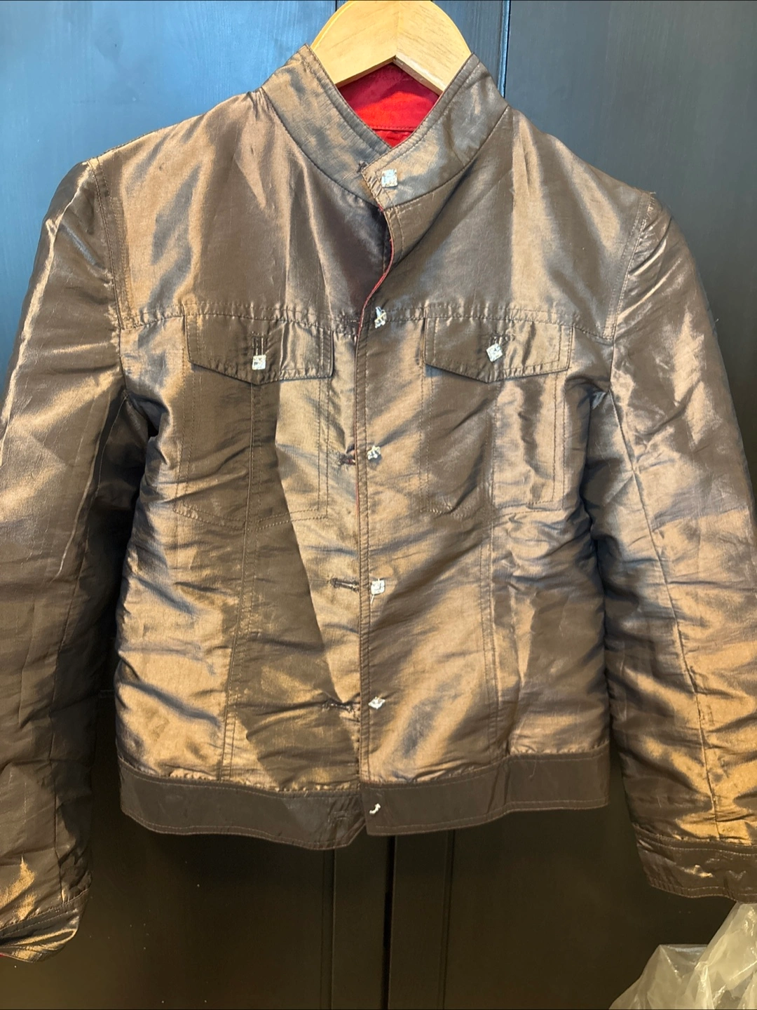 Beautiful metallic brown jacket. Size small. 100% silk. Dry clean only. Red silk lining. Features decorative buttons.
